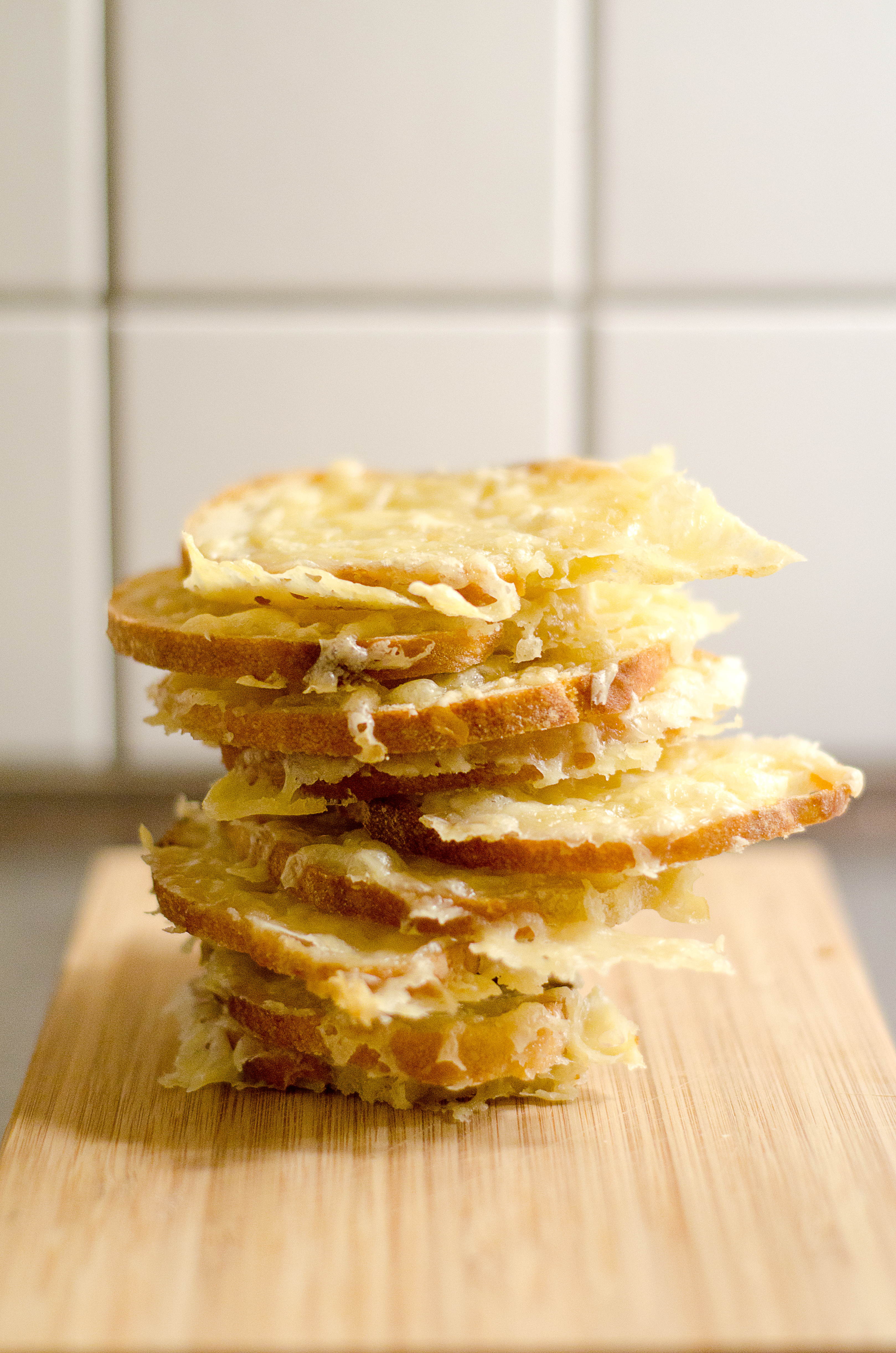 Ett perfekt tillfälle att använda överblivet bröd. Godast blir det med surdegsbröd. Skär brödet i tunna skivor (ca ½ cm) eller i tärningar. Lägg på bakplåtspapper och strö över riven ost (gott att blanda i en del riven parmesan också) och skjuts in i ugnen i 225 grader tills krutongerna fått färg.