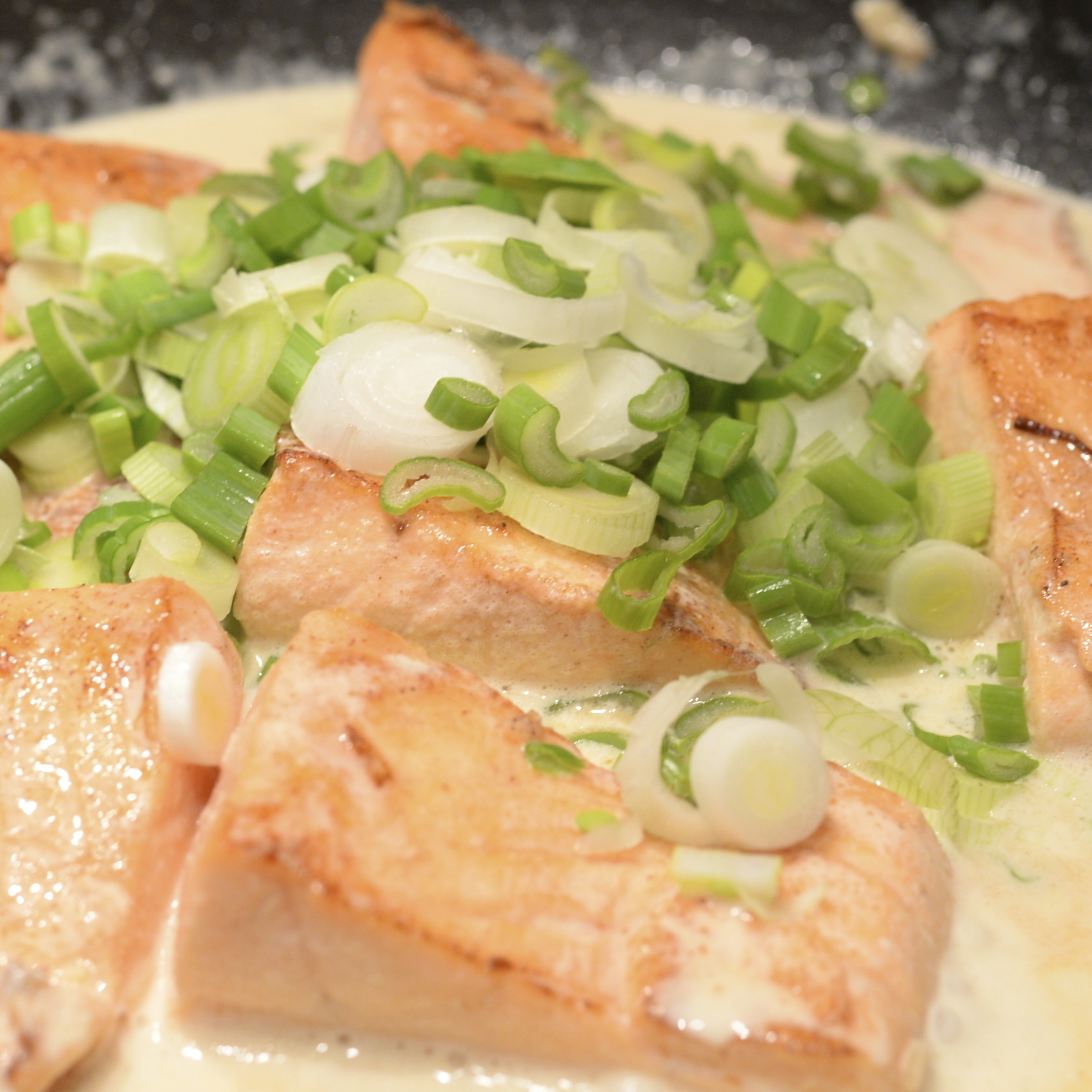Skär laxen i 8 kublikande bitar, hacka vitlöken. Stek laxen och vitlöken i smör, på hög temperatur i en stekpanna med hög kant. Vänd laxen efter ca 2 min, den ska ha blivit fint brynt. Slå på vinet, låt det koka upp och slå sedan på grädden, salta och peppra. Ge ett uppkok och dra sedan ned värmen till lägsta och låt stå ca 5 min, om du använder en stektermometer så är laxen är klar när den har en innertemperatur på 40 grader. Under tiden laxen står och blir klar så dela tomterna på mitten och slanta ner salladslöken. Vänd ner grönsakerna i pannan, riv ner basilikan samt riv över lite citronskal (använd gärna ett zestjärn till citronen annars så riv på finaste rivjärnssidan). Servera ur pannan med pressad potatis och spenatsallad.