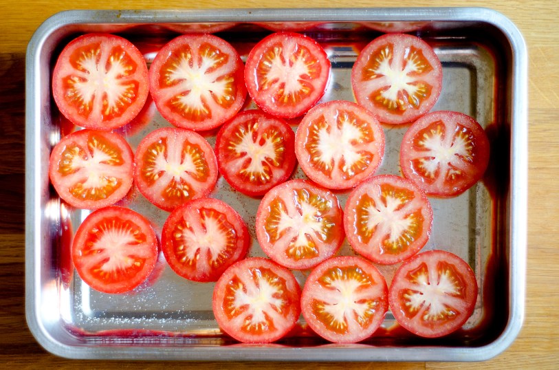 Dela tomaterna i halvor och lägg dem på en plåt med snittytan uppåt. Strö på salt och sätt in i ugnen på 75 grader i 2 timmar. Smält socker och honung i en kastrull och låt det karamellisera, alltså få lite färg. Tillsätt övriga ingredienser, inklusive tomaterna och koka på medelhög värme utan lock i ca 30 min. Mixa allt fint och smaka av med salt. Passera sedan genom en finmaskig sil. Frys gärna in i mindre burkar, så kan du ta fram lite i taget, då hållbarheten inte är lika bra som köpt ketchup.