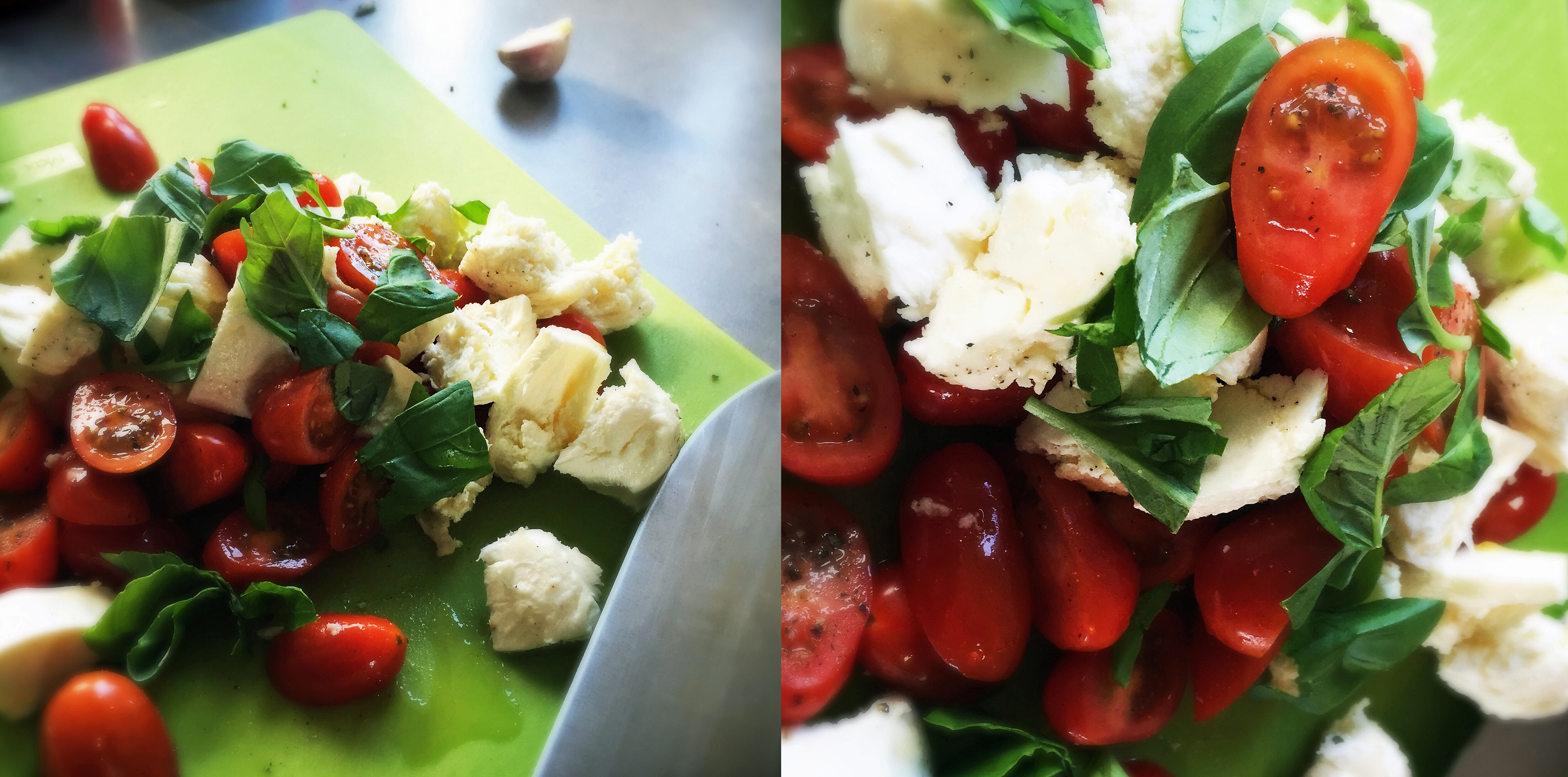 Medan pastan kokar kan du passa på att göra mozarellasalladen. Skär ner allt och krydda med salt, peppar och olivolja.