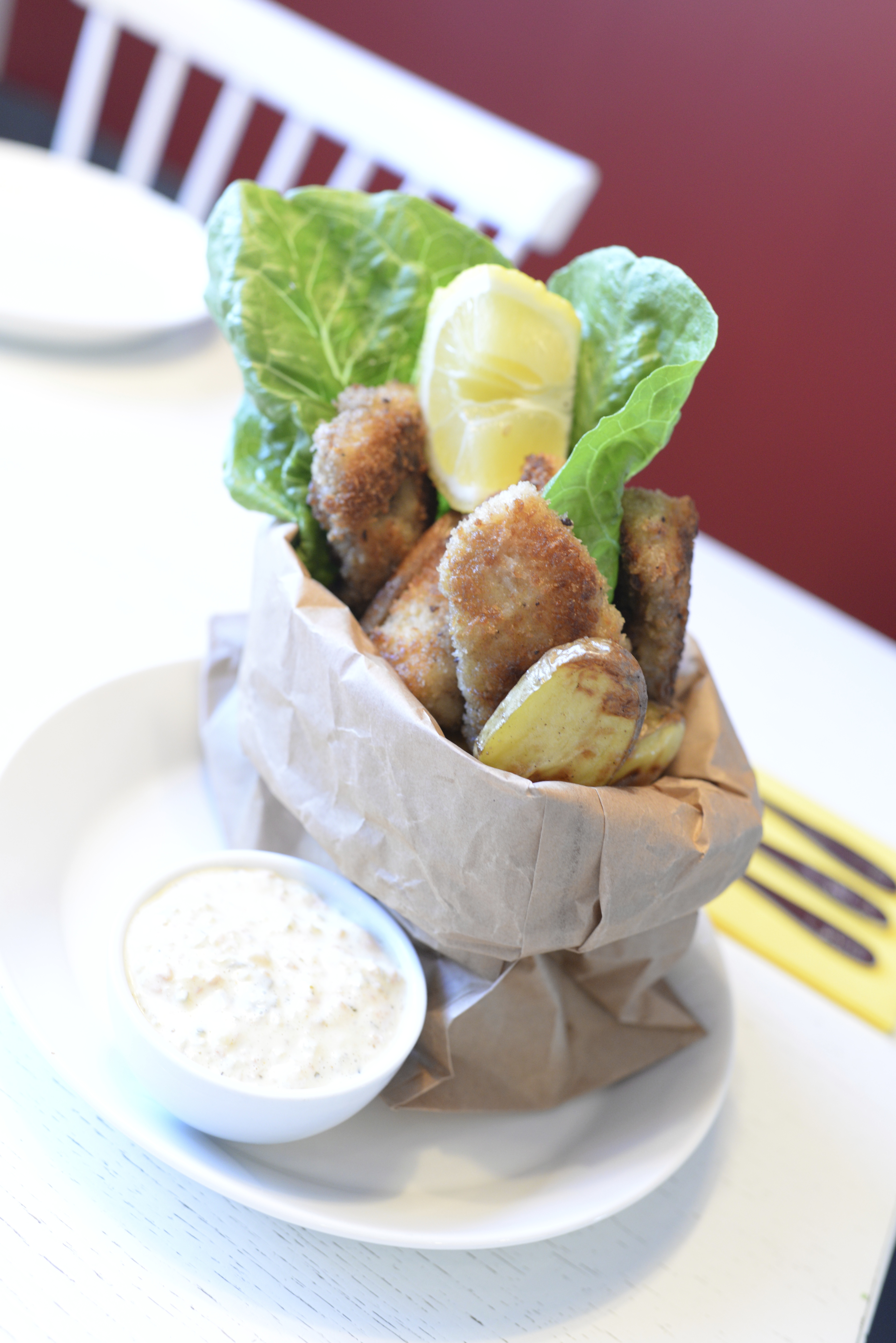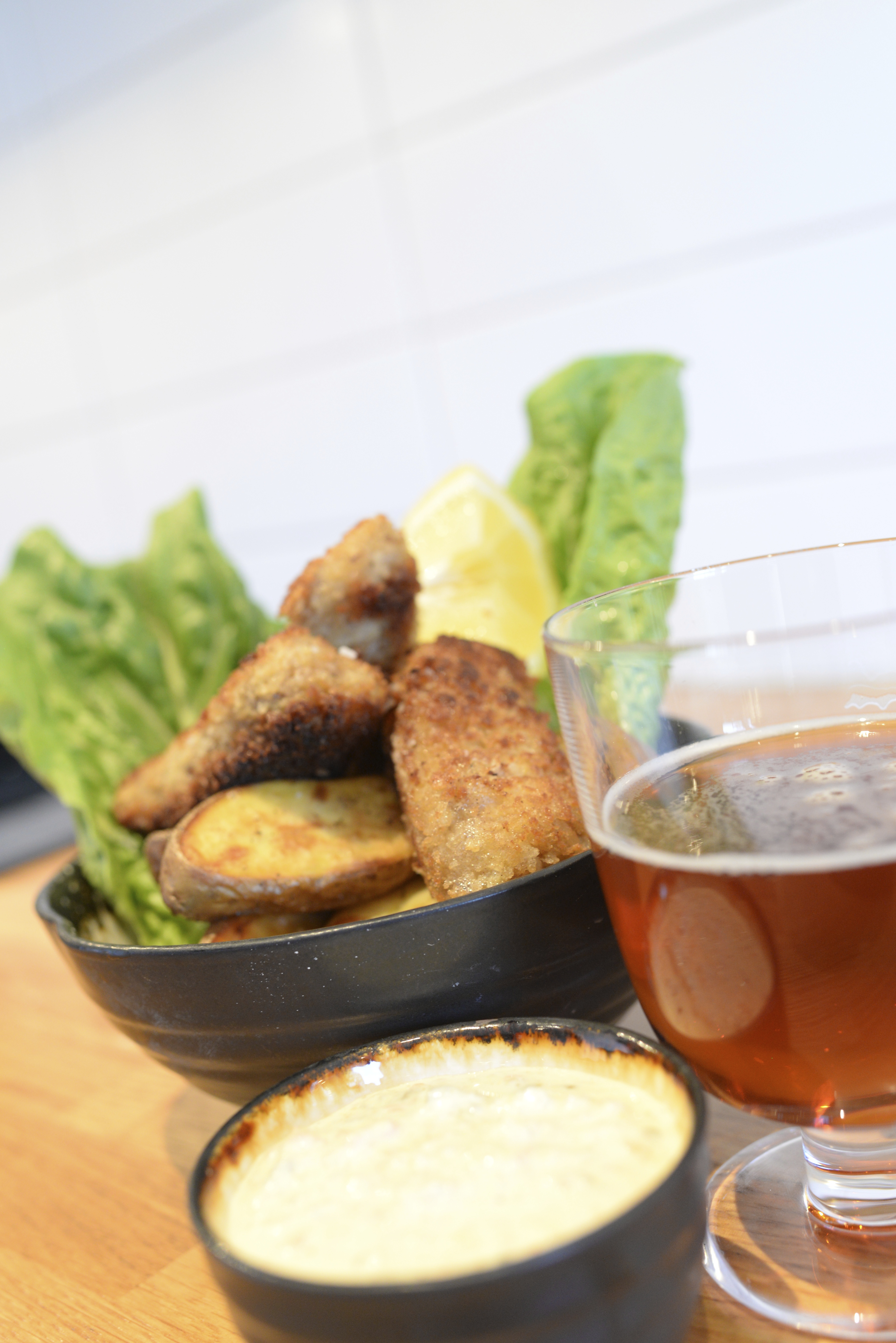 Detta är en hemmavariant av en populär och god rätt. Jag ugnsrostar mandelpotatisen och steker fisken. Vi serverar den på ett lite skoj sätt, både i skål och pappåse som var väldigt populärt hos Sixten. Han åt med god aptit och tyckte det var både gott och kul att äta med händerna och dippa i såsen. Jag gör en väldigt snabb variant på majonnäs, du behöver en handmixer och en hög smal byta. Du kan självklart välja att använda färdig majonnäs om du känner att det känns snabbare, men hemgjord blir betydligt godare.