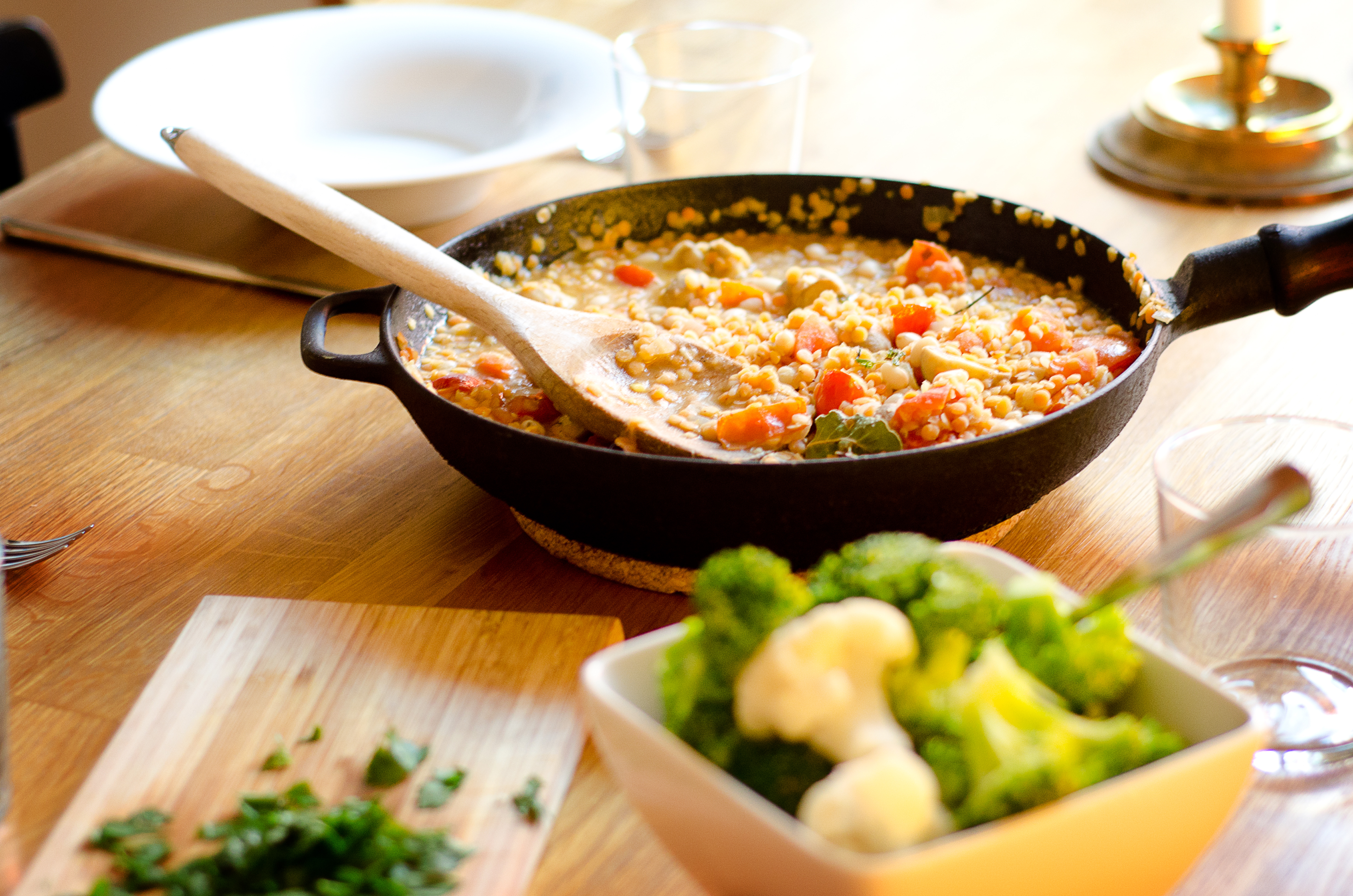 En god, snabb och lättlagad vegetarisk rätt som kan serveras helt vegetarisk eller som tillbehör till kött och fisk. Vår 1-åring älskade det, 7-åringen tyckte det var sådär och 10-åringen tyckte det var ok. Det är schysst att låta ragun koka ihop till en ganska simmig konsistens.