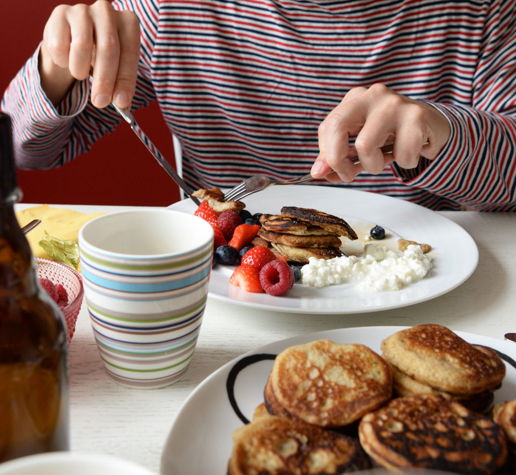 De plättar som eventuellt blir över plockar vi fram till lunch åt Sixten, som gärna äter en hög igen. Jag brukar använda en plättlagg, men det går självklart att göra dessa i vanlig panna som pannkakor. Det här är även ett bra sätt att bli av med de där övermogna bruna bananerna på. Vi serverar vår plättar med frukt och bär efter säsong, keso och lönnsirap.