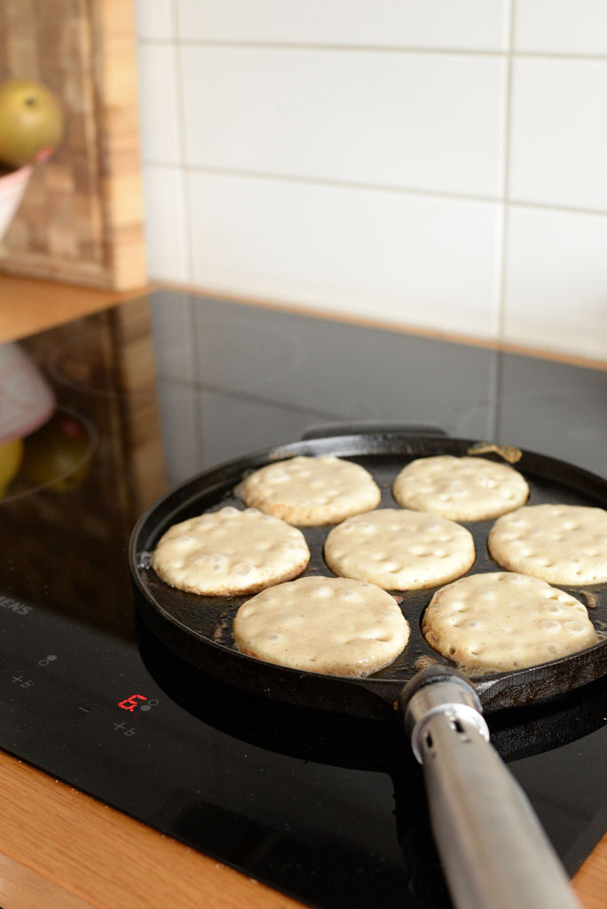 Du ser att det är dags att vända på plättarna/pannkakorna när de svält lite, vilket tar ca 1 – 2 minuter.