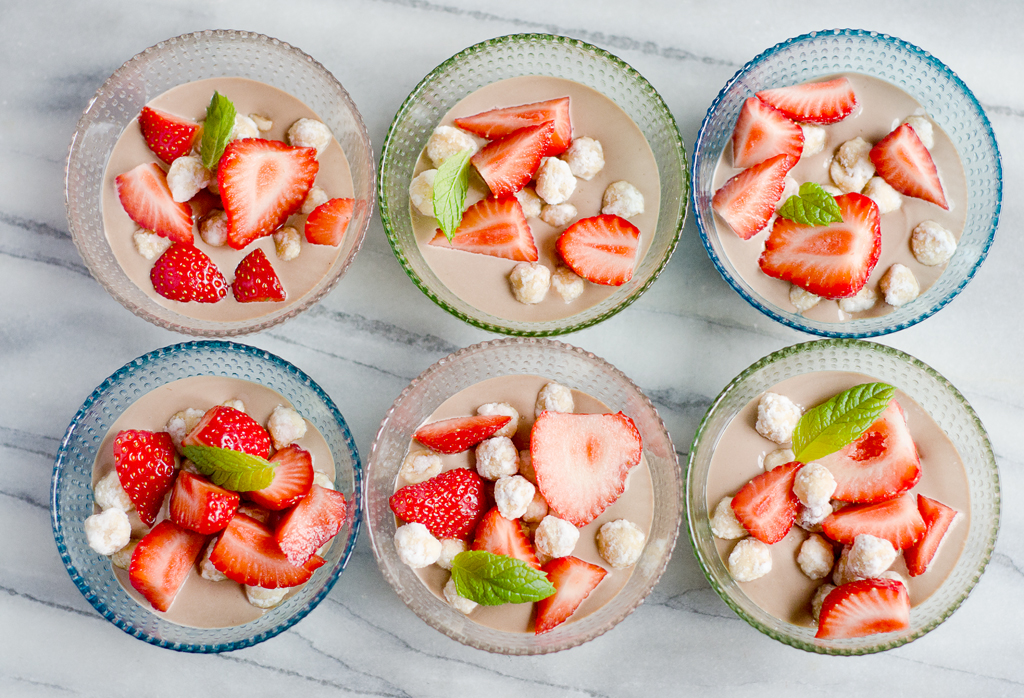 Den här desserten är så barnsligt god och härligt somrig med jordgubbarna till. Den kan varieras efter säsong med olika tillbehör, beroende på vad som finns just då (tänk som julbordsdessert med nötter och nedhackade fikon till, mums!). Perfekt till midsommar eftersom du kan förbereda den flera dagar innan och bara ta fram när det är dags för servering och garnera med nötter och bär. Viktigt i detta recept är att använda en termometer för att få ett bra resultat.