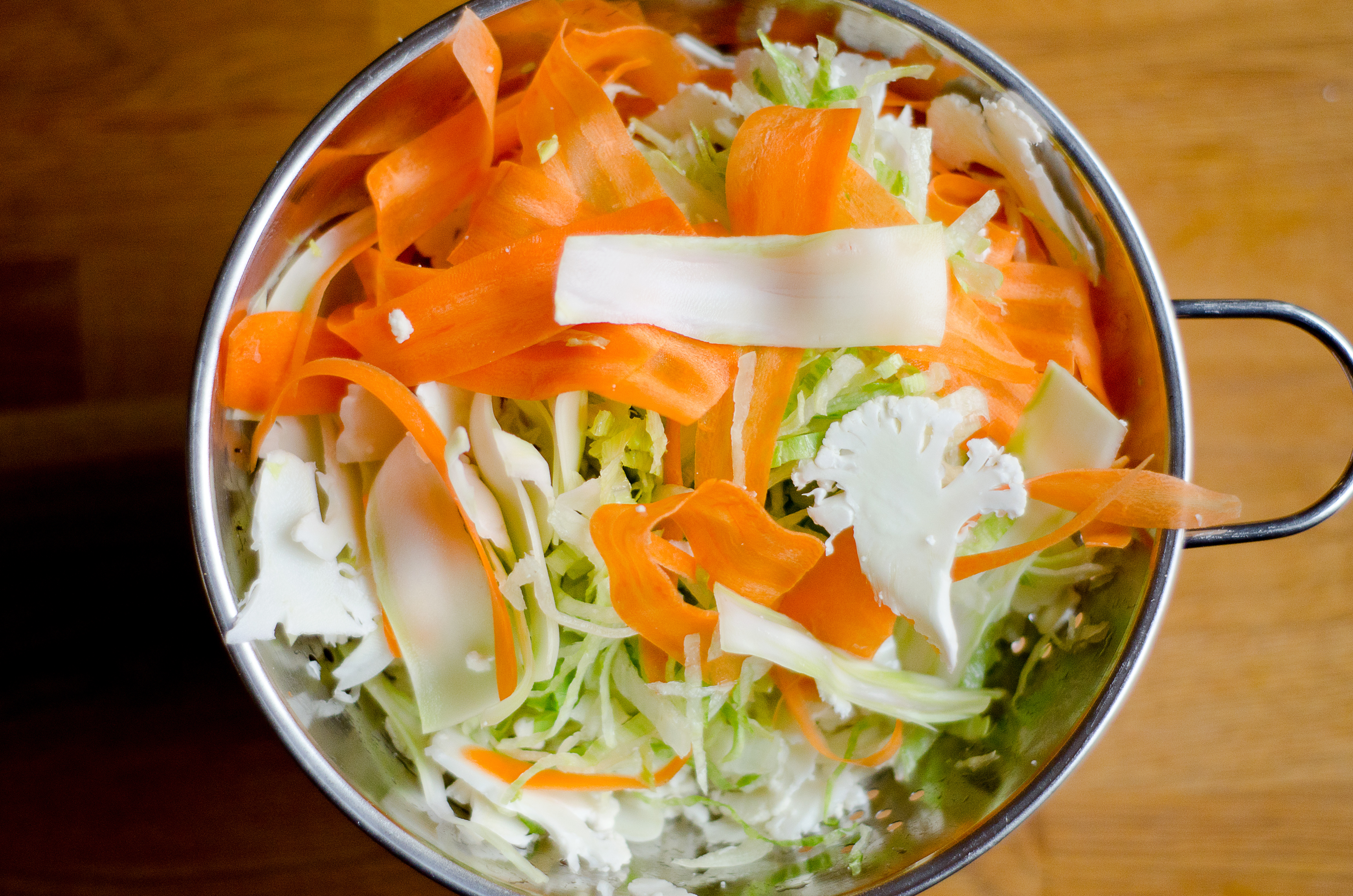 Blomkålen och broccolin hyvlas fint, enklast med en mandolin, annars med osthyvel eller potatisskalare. Salladen skärs i strimlor. Blanda saften från en citron med soja och olivolja och häll över salladen. Blanda runt alltsammans.