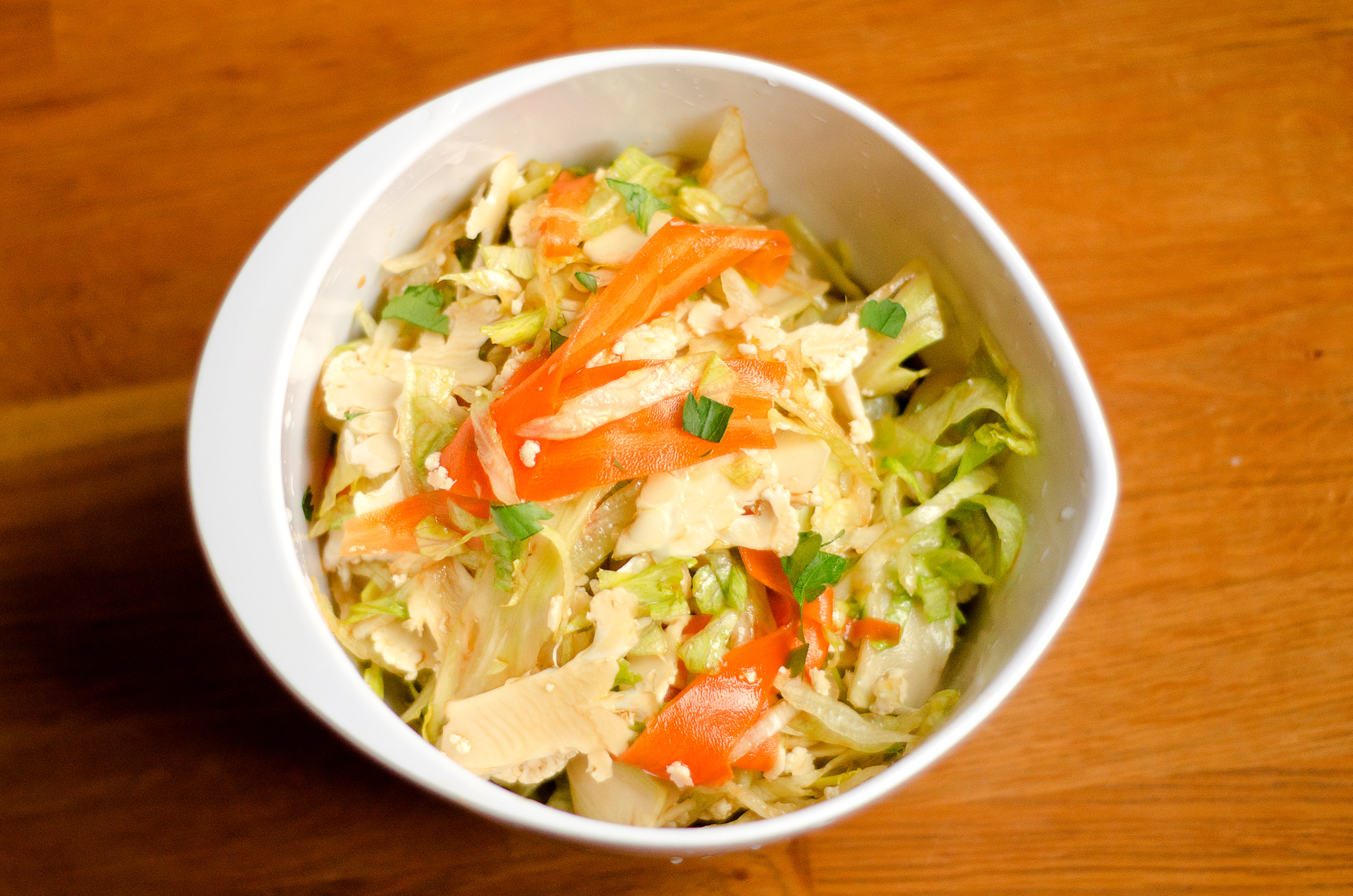 Krispiga boveteplättar, örtkeso och kålsallad med soja och citronvinägrett