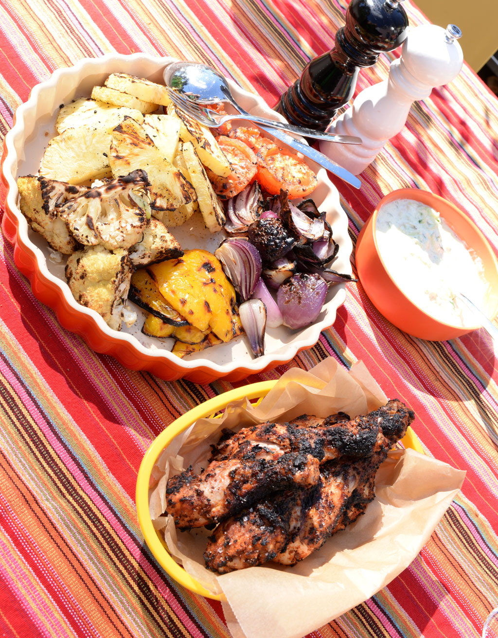 En fräsch och somrig rätt med indiska smaker. Det kan kanske kännas trixigt att grilla en vardag men denna rätt går snabbt att förbereda och eftersom allt grillas tar det ändå inte så lång tid. Jag använder mig av en klotgrill. När jag grillar ex. kyckling och lite större saker så använder jag locket mycket för att reglera temperaturen. På detta vis så slipper jag få en bit som är bränd på utsidan och rå i mitten.