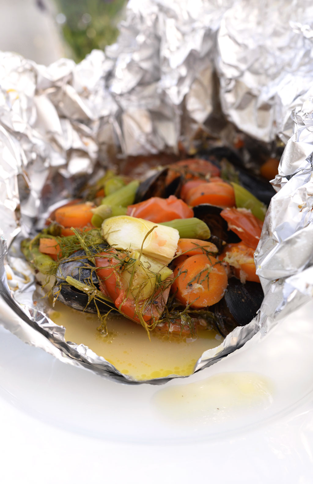 Vik upp kanterna genom att dra upp varje hörn. Häll sedan 1 msk vitt vin på varje knyte. Vik ihop och se till att knytena är täta. Lägg sedan på grillen i ca 12 min under lock. Smygtitta sedan i ett knyte, har musslorna öppnat sig är knytena klara, om inte låt dom gå några minuter till. Tag av värmen och låt stå till sig i ca 10 min. Öppna sedan upp dom på en halvdjup talrik. Servera med nybakt bröd.