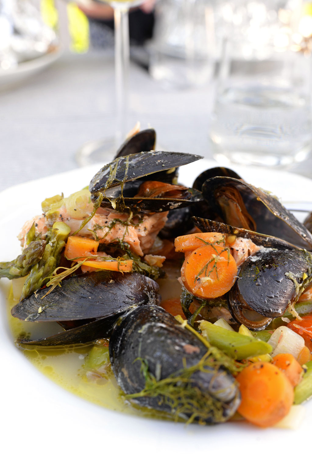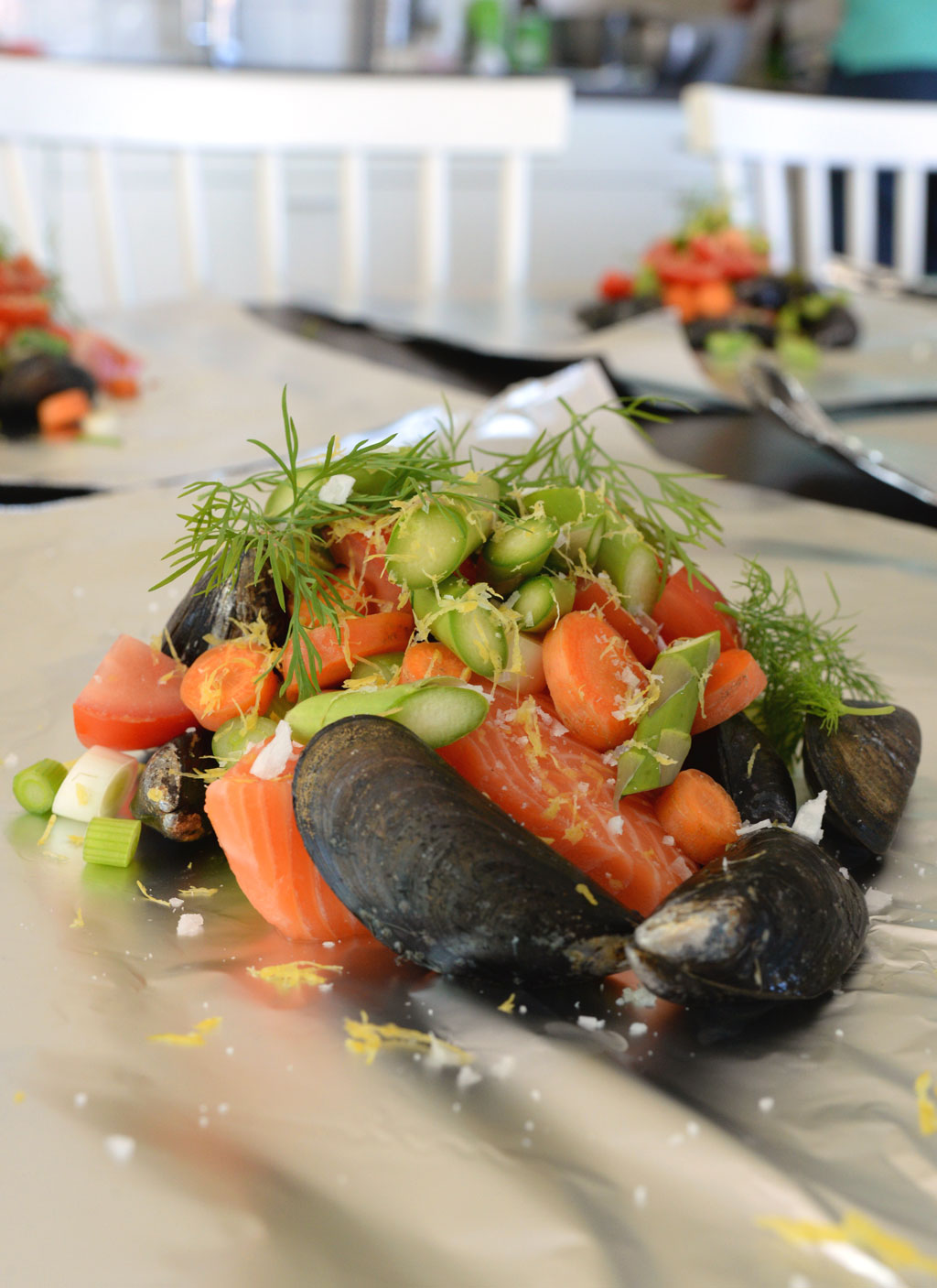 Skär laxen i 12 kuber, skär morot, sparris och salladslök i ca 3 cm långa bitar. Tärna upp tomaterna och hacka vitlöken. Fördela smöret på de fyra aluminiumarken, lägg på vitlöken, lägg sedan 3 laxkuber på varje ark. Fördela upp musslorna och grönsakerna, plocka över och fördela dillen, finriv citronskal, salta och peppra på varje knyte.