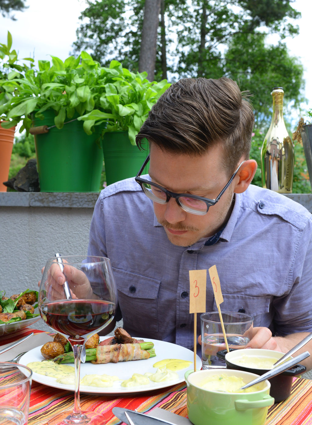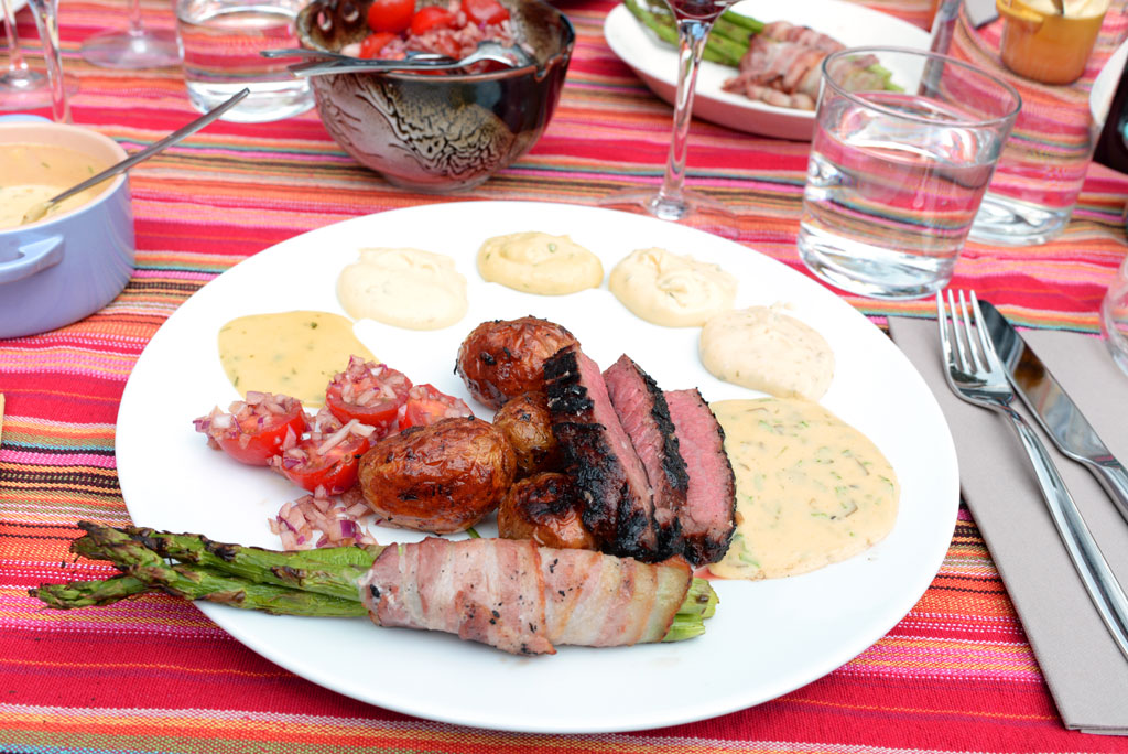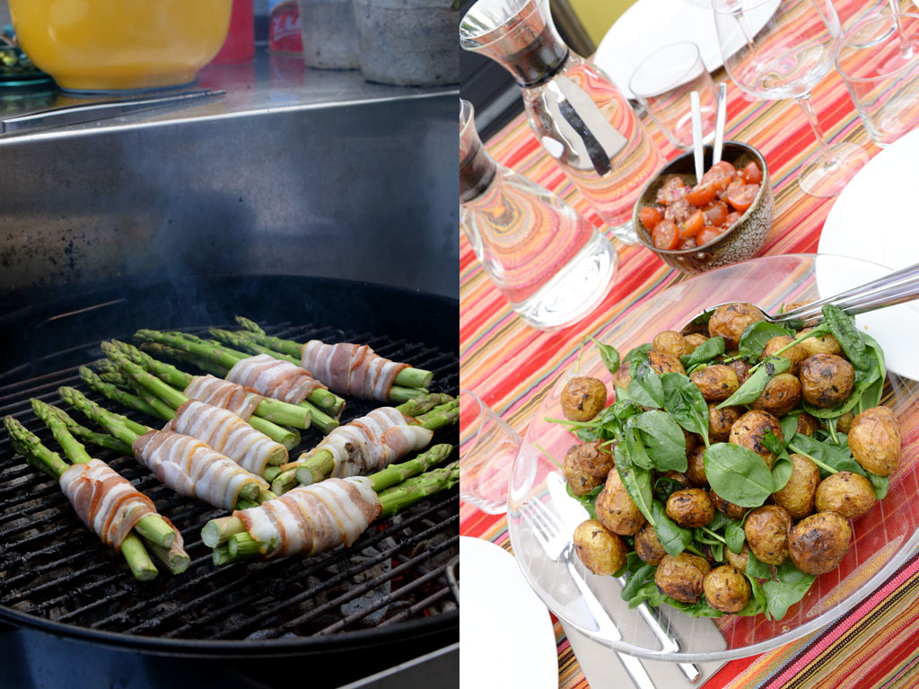 Tillbehören var sparris inlindad i bacon, tomatsallad med lök och balsamicovinägrett samt en potatissallad på ugnsbakad färskpotatis och spenat. Vi hoppades kunna föra tankarna till en klassisk plankstek!