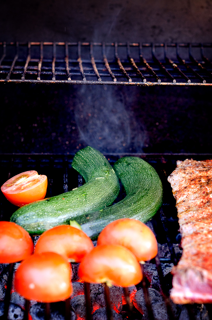 Mina grillade spareribs är väldigt uppskattade i hela familjen. Barnen gillar att gnaga och få använda händerna. Till grillat tycker jag mest om att använda torra kryddblandningar som gnids in i köttet, för att undvika att det börjar brinna och bränns av olja och glaze. Glaze av olika slag använder jag gärna i slutet av grillningen. De grillade grönsakerna i örtmajo är grymt gott och enkelt tillbehör till grillat. Skönt att kunna variera med något annat än potatis. Servera gärna med ett gott bröd.