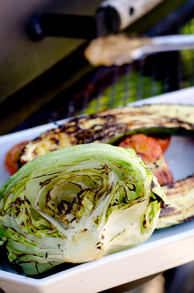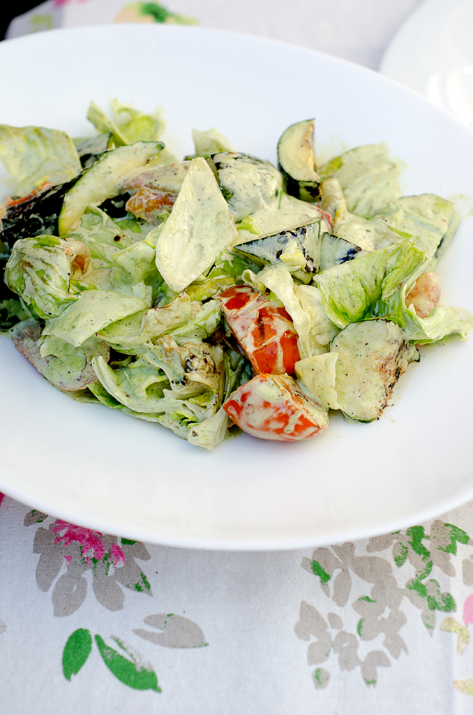Börja med att gnida in köttet med kryddblandningen på båda sidor. Hacka sedan örterna och riv vitlöksklyftan fint. Blanda med majonäsen. Dela tomaterna i halvor, liksom zucchinin och behåll isbergssalladen halv. Det är enklare att grilla stora bitar grönsaker och dela efteråt.