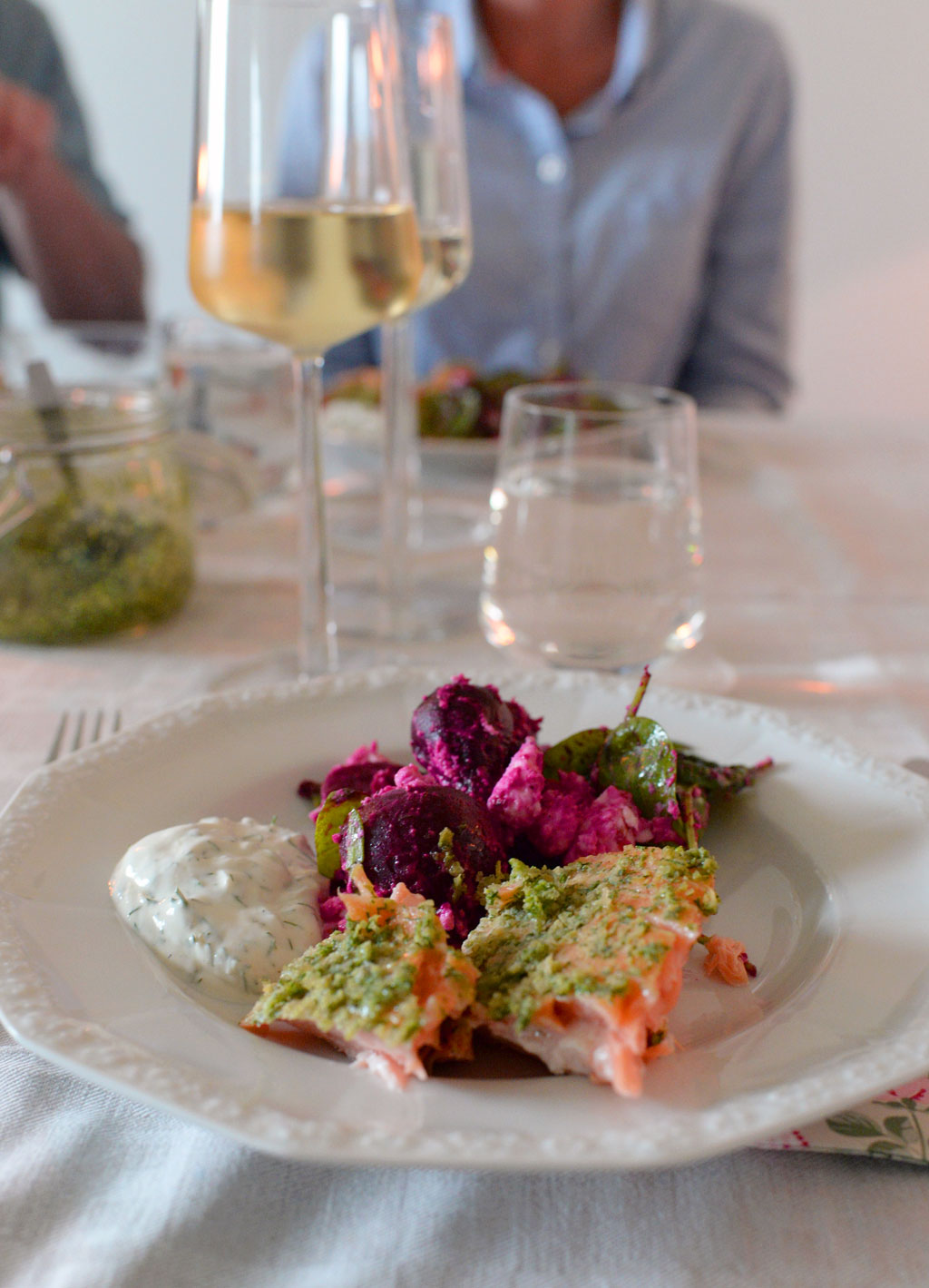 Gnid in laxsidan runt om hela med saltet. Lämna gärna och låt rimma i ca 1 timme, har du inte tid med det så låt rimma så länge du har tid. Börja med laxen, sedan sätter du på rödbetorna och efter det så tänder du grillen. När du fått en bra glöd så lägger du laxen på grillen med skinnsidan nedåt. För att underlätta att plocka laxen av grillen så kan du lägga fisken antingen i ett grillhalster på grillen eller om du lägger en aluminiumfolie mellan fisk och galler. Grilla sedan under lock enbart på skinnsidan i ca 10-12 minuter, till en innertemperatur på 39-40 grader. Om du lagt fisken direkt på gallret så lyft av från grillen med två större stekspadar, så går det lättast.