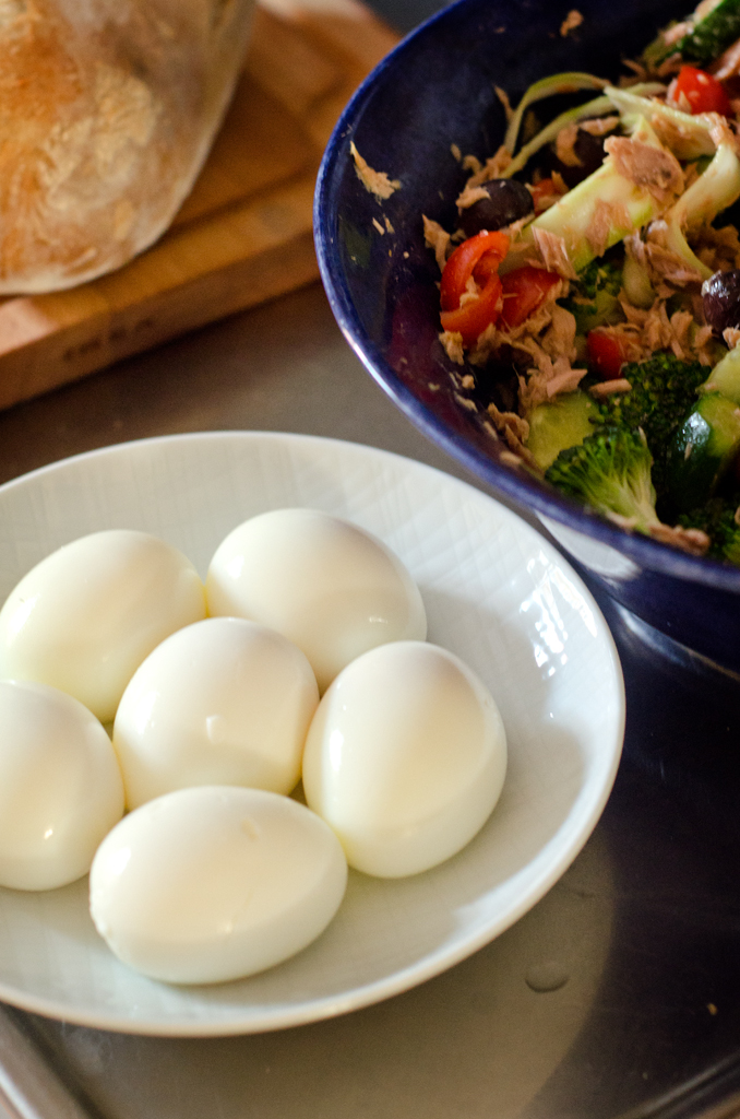 Häll av tonfisken. Blanda alla ingredienser utom äggen och smaka av med salt och svartpeppar och eventuellt med olivolja. Halvera äggen och lägg ovanpå. Hoppas ni gillar det!