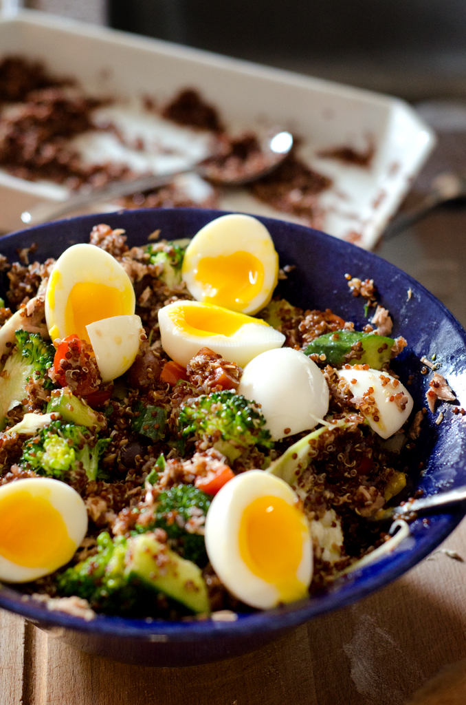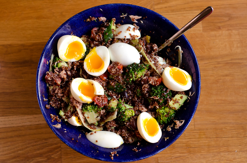 Börja med att ha i quinoan i en kastrull, sätt på hög värme och rosta quinoan en stund. Den brukar börja ”poppa” när den är färdigrostad. Ha i vatten och salt och tillaga enligt tiden på förpackningen. Låt den svalna en stund och blanda sedan med olivolja, pressad citron och fint riven vitlök. Koka äggen i ca 6 minuter, så de blir krämigt löskokta.
