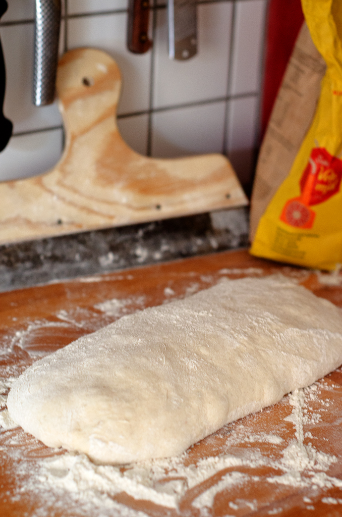 Allt utom saltet blandas i en hushållsassistent med degkrok, kör på medelhög hastighet i 5 min. Tillsätt salt och kör i ytterligare 5 min. Stjälp upp degen i en oljad plastbunke och låt jäsa cirka 8 timmar, ”spänn” degen ungefär varannan timme. Att spänna degen innebär att vika degen från ena sidan till den andra från alla håll och sedan vända den släta sidan uppåt. När degen jäst klart, stjälp upp den på väl mjölat bakbord.
