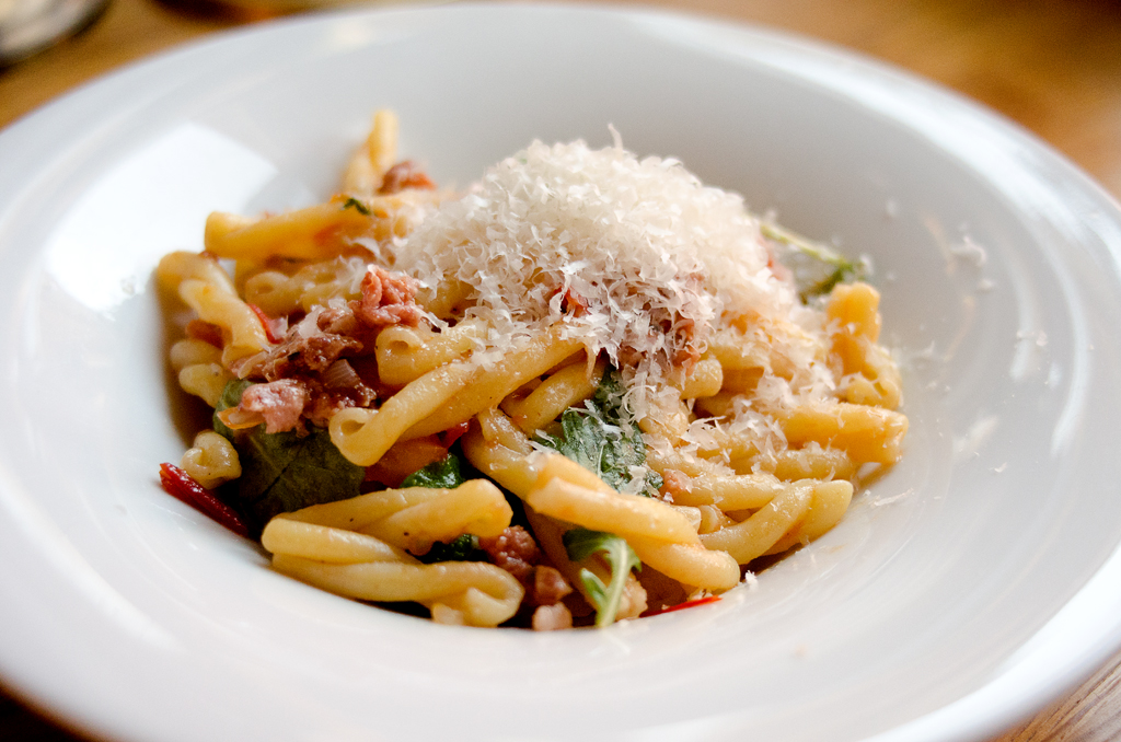 Då pastan kokat klart, häll av vattnet och ha i pastan i stekpannan. Blanda runt allt och servera med riven parmesanost.