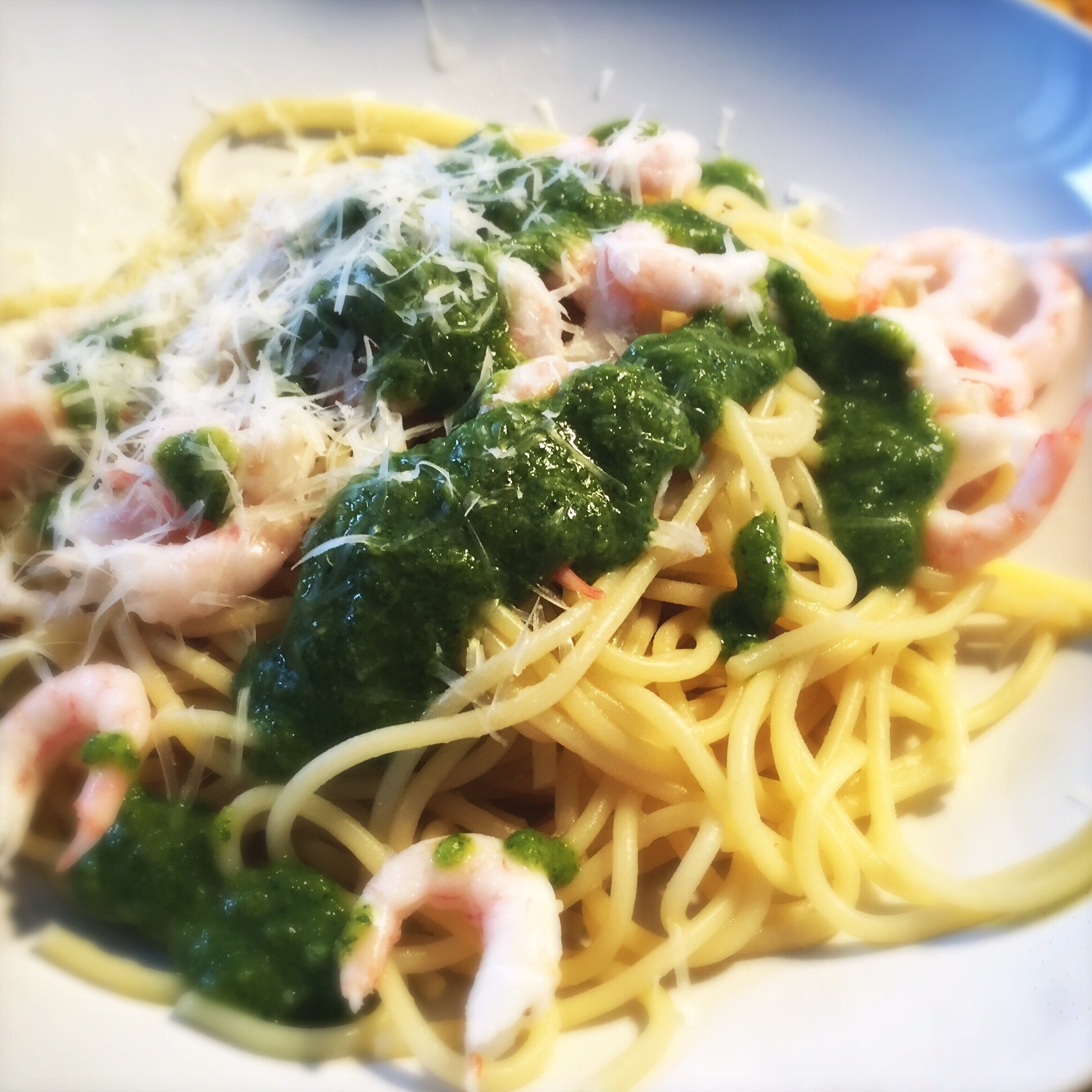 Pasta i mängd efter hur många ni är. Peston är beräknad för 4 vuxna men blir säkert lite över. 200-300gram handskalade räkor, vi använde oss av icas som vi tycker är bra. Servera gärna med en grönsallad till.