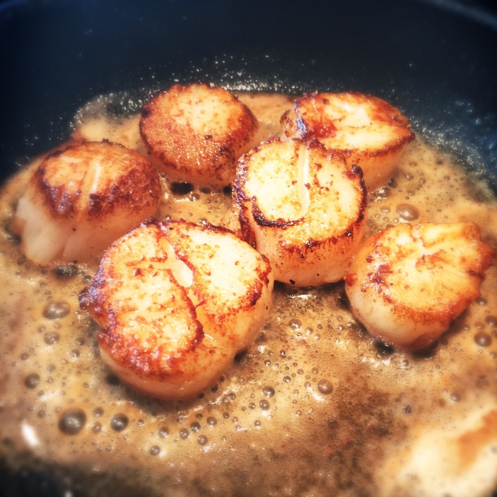 Stek pilgrimsmusslorna på hög värme i smör. Ca 30-40 sekunder per sida.