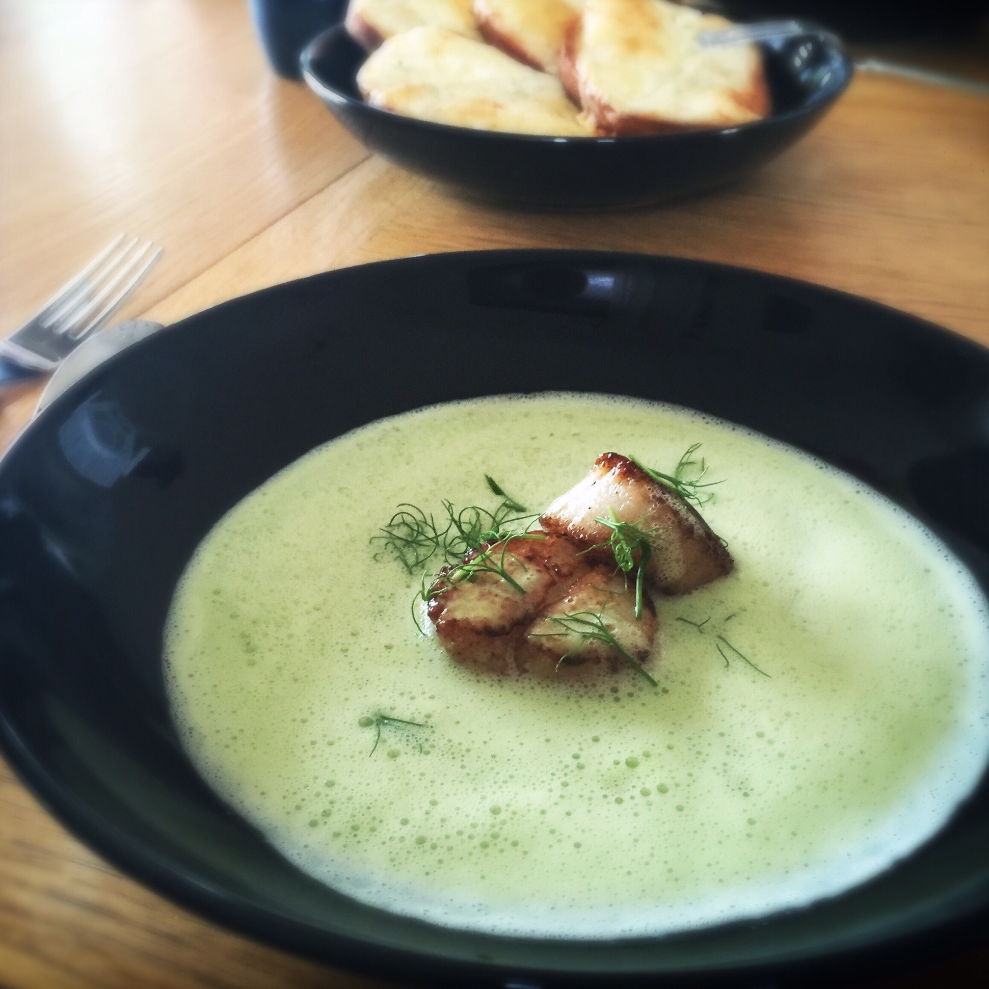 Vi blev lite sugna på soppa och just Creme Ninon är lite av en favorit. Passar perfekt som en förrätt, men även som kvällsmat hemma en vardag. Tillbehören kan varieras stort, denna dag blev det pilgrimsmusslor och andra varianter kan vara bacon, lax eller en god kryddig korv. Sen är det ju galet gott med nybakt bröd till!