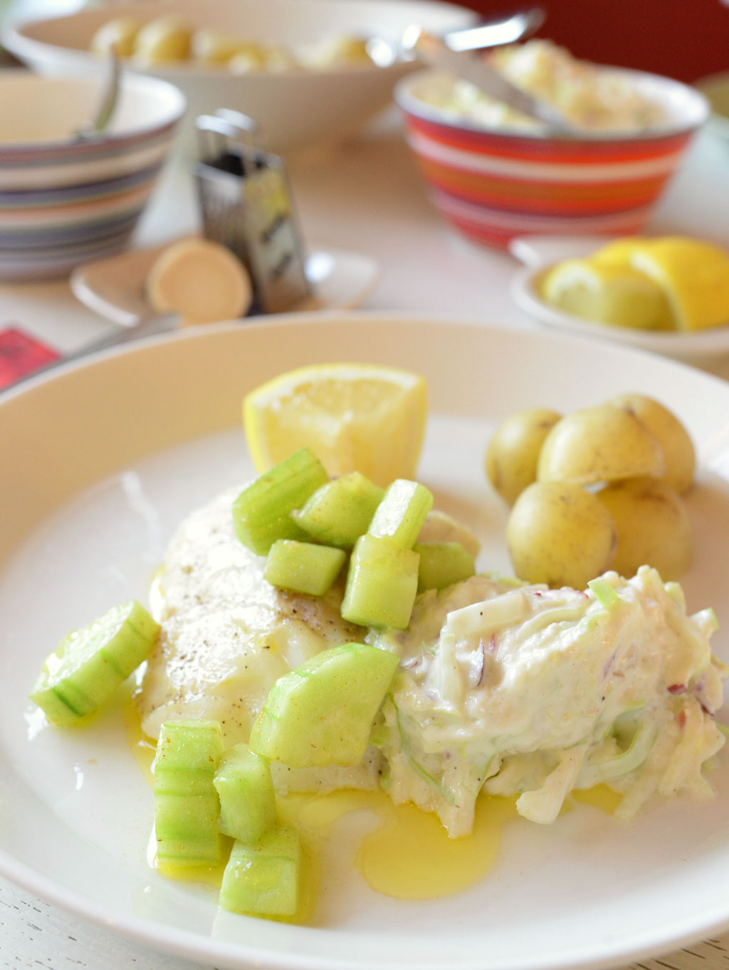 En snabb och lättlagad rätt, som vi serverar kokt färskpotatis till. Om du börjar med att sätta på potatisen och sedan köra in fisken i ugnen, så är allt klart samtidigt på mindre än 30 minuter. Jag använder ofta yoghurt av mezetyp istället för majonnäs till olika såser och röror, det går både snabbt och ger en bättre fräschör. Sigge var väl måttligt förtjust i den varma gurkan, han ville ha gurkan kall istället, men vi vuxna uppskattar lite variation.