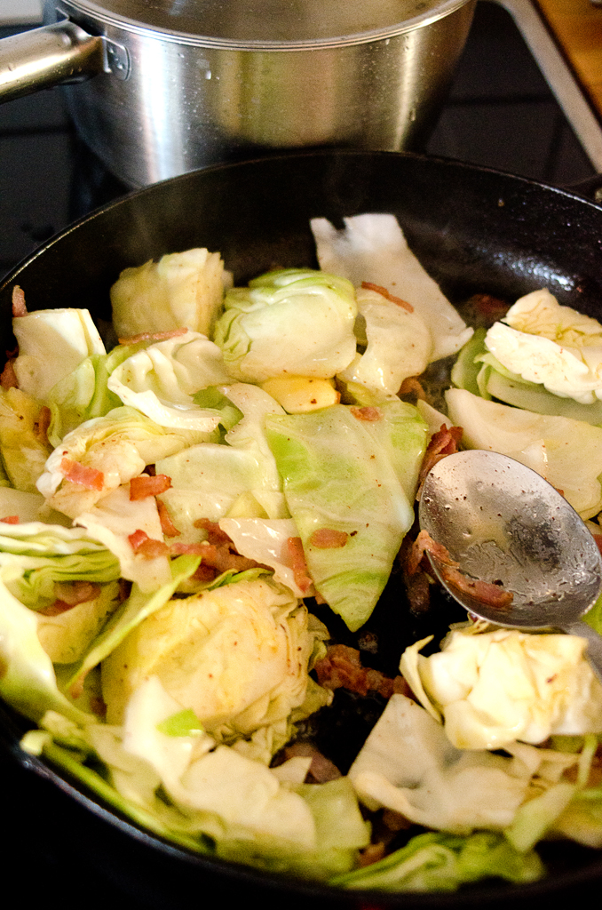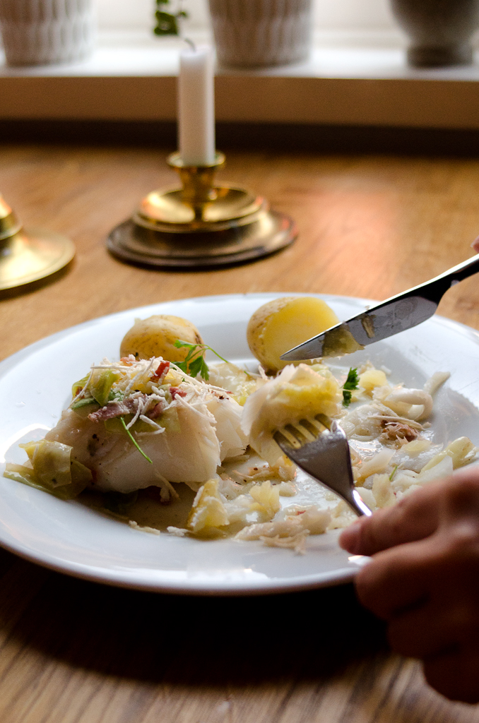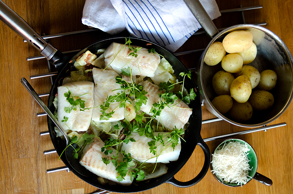 Börja med att koka potatisen och sätta på ugnen på 160 grader (varmluftsugn). Skär torskfilén i portionsbitar. Dela kålen i grova bitar. Strimla baconet och stek med lite smör i en stekpanna, så det blir brynt. Ha sedan i kålen och stek med och ha i ytterligare en klick smör. Pressa i en halv citron när kålen börjar mjukna.
