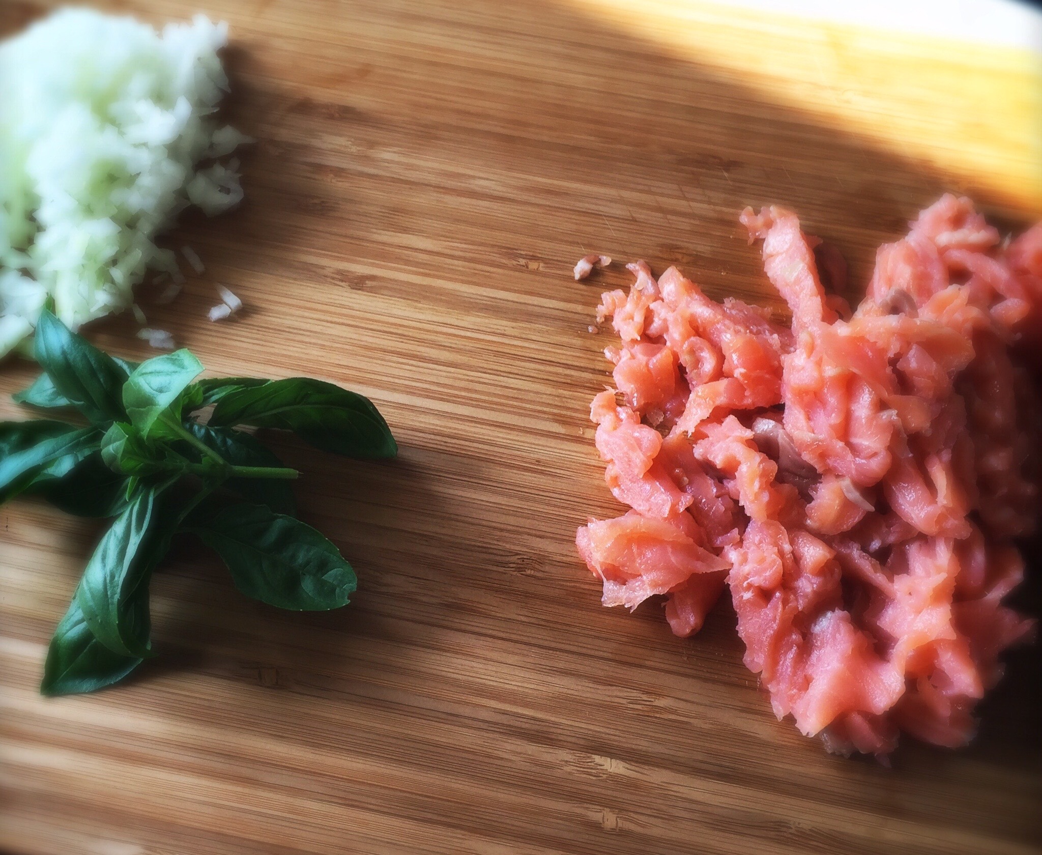 Strimla laxen, finhacka löken, riv eller pressa vitlöken. Fräs lök, vitlök och sambal i smör. Lägg ner laxen och slå på grädden, koka upp. Slå i citronsaften och tillsätt hälften av basilikan. Tillsätt osten och dra bort från plattan.