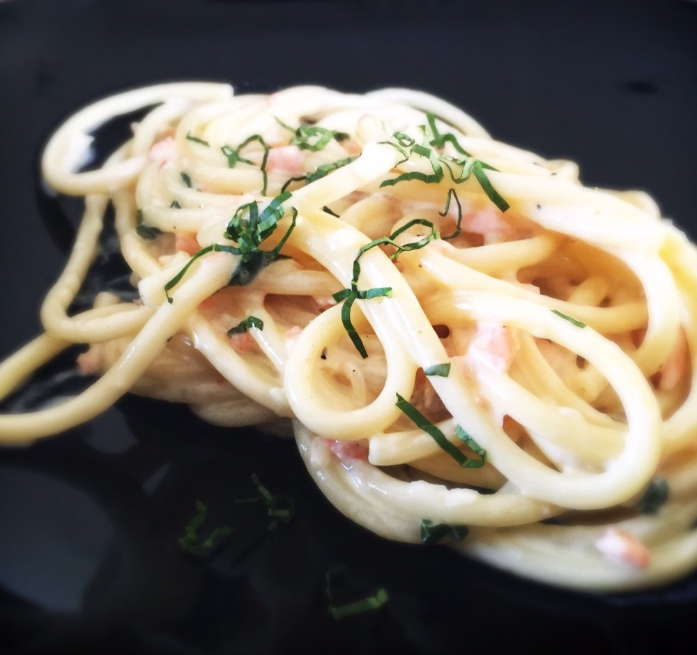 När pastan är nästan färdig häller du av vattnet och häll i laxsåsen. Låt det koka ihop till en krämig konsistens, ett par minuter. Smaka av med salt och svartpeppar. Späd med pastavattnet om det är för tjockt. Toppa med resterande basilika och servera!