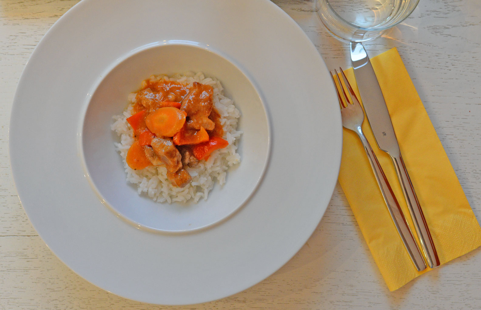 Låt koka i ca 2 minuter och tillsätt sedan morötterna, socker och vinäger, låt puttra i ca 10 minuter, smaka upp med salt och peppar. Tillsätt paprikan, rör om och låt få ett uppkok. Servera med ris.