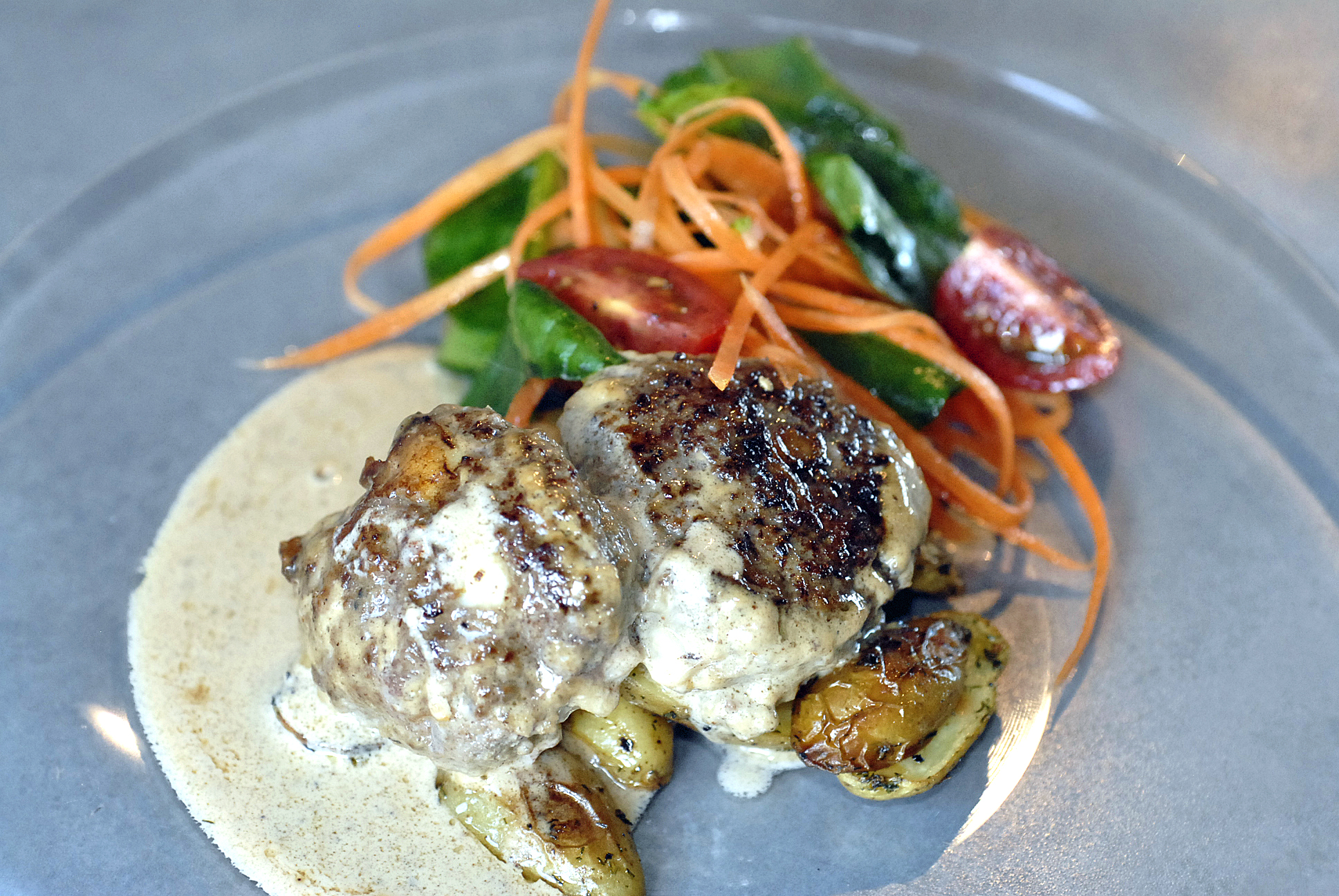 Mixa basilika och soltorkade tomater. Skär mozzarellan i mindra bitar. Blanda sedan färsen med ägg, grädde, basilika och tomatmixen och mozzarella. Salta och peppra. Forma sex biffar. Blöt gärna händerna med kallt vatten så fastnar det mindre på händerna. Stek biffarna på ganska hög värme, några minuter per sida, i rikligt med smör. Lyft upp biffarna och rör ner grädde, philadelphia och buljongtärning i steksyn. Låt koka upp och smaka av, lägg sedan i biffarna och låt dem puttra med tills de är genomstekta.