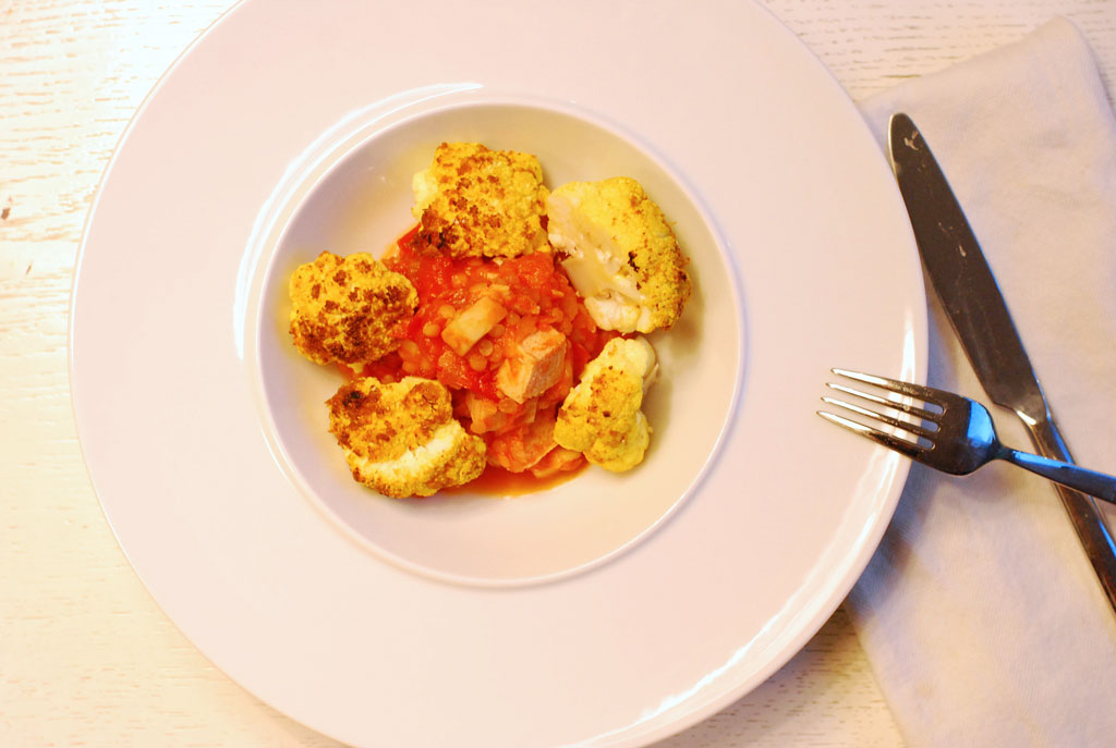Blomkål i alla former är en stor favorit i vårt hem, i alla fall hos oss vuxna. Här rostar jag den på hög värme, och får på så vis forfarande en knaprig känsla inåt mitten. Till Lo mixade jag samman allt till en puré, och hon åt med god aptit.