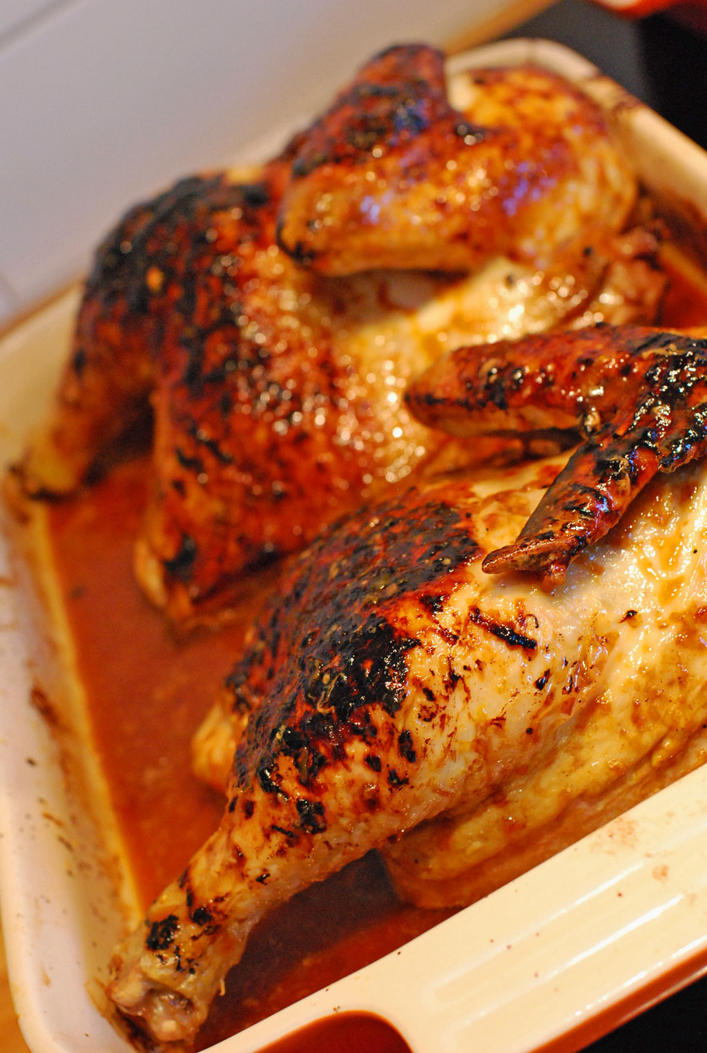 Om du använder en hel kyckling så dela den på mitten med en sax, på detta vis så halverar du nästan tillagningstiden. Krydda kycklingen runt om och stek sedan på hög värme i olivolja så den får en gyllenbrun färg. Lägg kycklingen i en ugnsfast form som är precis lagom stor för mängden kyckling, den hela kycklingen lägger du med benet neråt. Slå nu över apelsinsåsen ovanpå kycklingen, kör in i ugnen, den hela kycklingen tar ca 20-30 minuter och filerna ca 6-10 minuter. Ös gärna kycklingen några gånger under stektiden med såsen i formen. Kolla innertemperaturen med en termometer, vid den tjockaste delen på lårbenet, den ska vara 78-80 grader, tag då ut och låt vila ca 10-15 minuter innan du skär upp den. Kycklingfilé ska ha en innertemperatur på 65 grader.