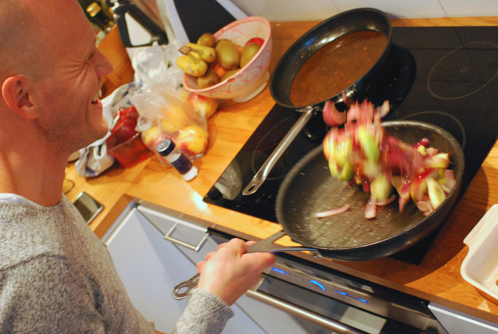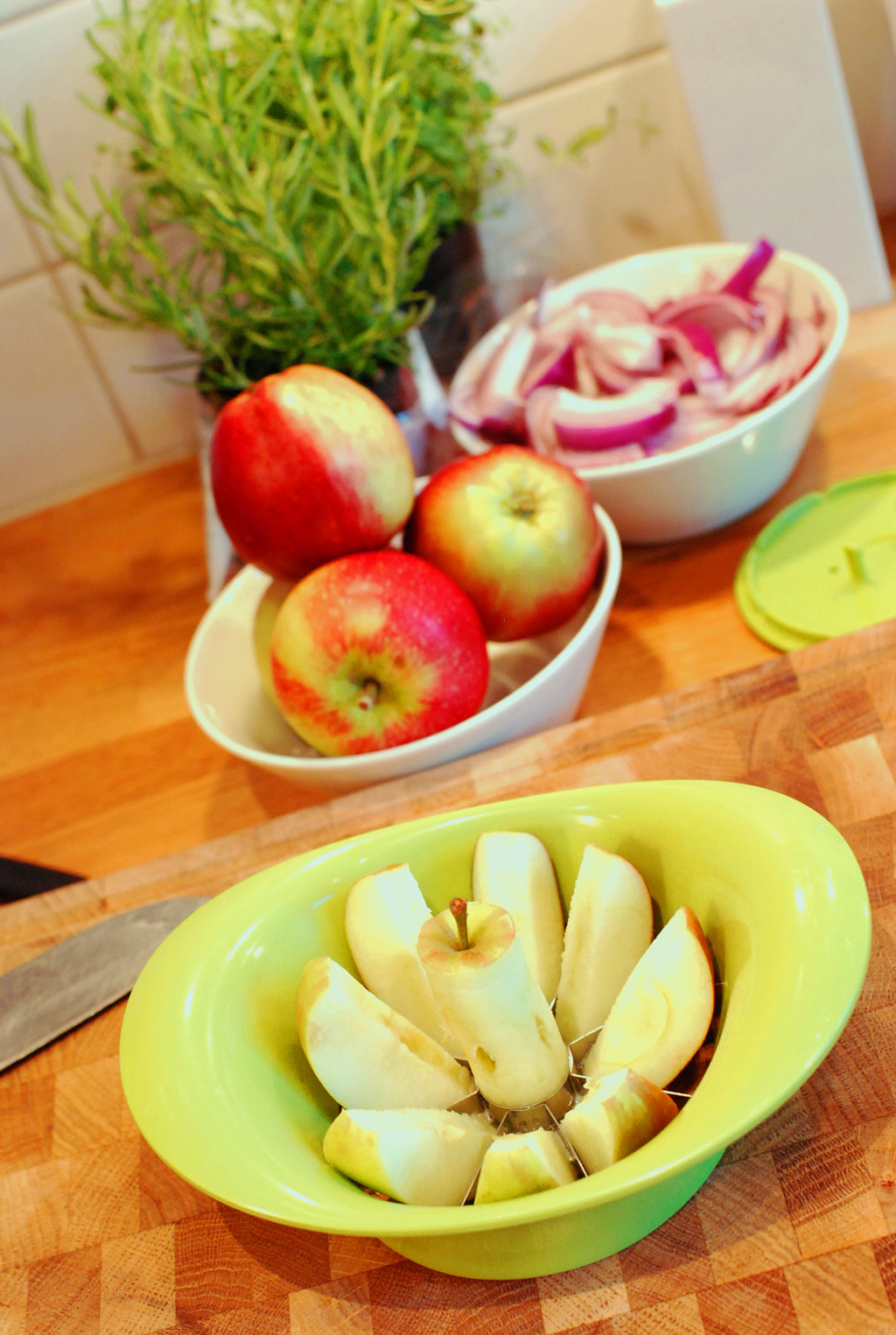 Skala löken, dela den på mitten tvärs över och skiva längs med i båtar. Klyfta och kärna ur äpplet.