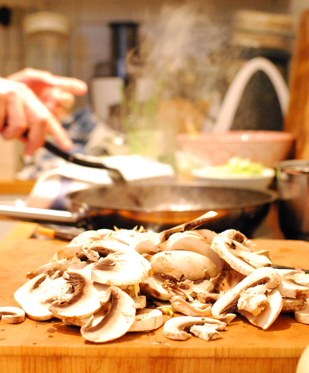 Ansa svampen och dela i mindre bitar. Skär sv roten och det översta gröna på purjolöken, snitta den halvt igenom längs med och skölj bort eventuell jord under rinnande vatten. Skiva den sedan i ca 1 cm tjocka skivor. Skala och riv vitlöken. Värm en stekpanna på hög värme, lägg i en stor klick smör och börja med att steka den frysta skaven. När köttet börjar fä lite färg så tillsätt svamp, lök och vitlök och fortsätt att steka några minuter tills allt fått färg. Slå nu på grädden, tillsätt gelé, soja, timjan, salt och peppar. Låt puttra samman på låg värme ca 5 min. Gör under tiden salladen.