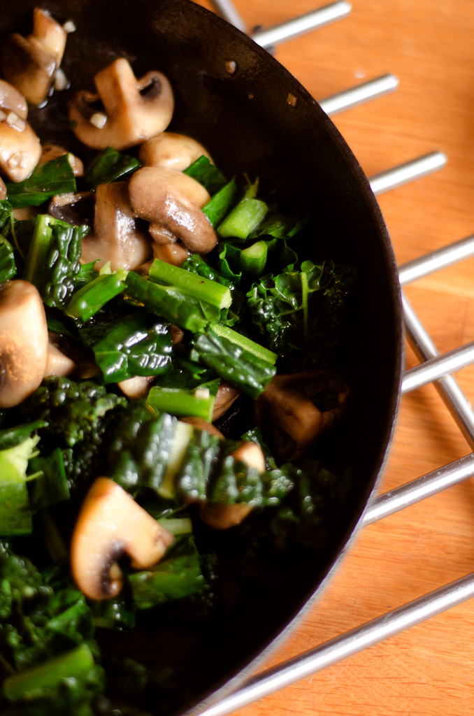 Fräs kvartade champinjoner i olivolja, när de fått färg har du i hackad vitlök, strimlad svartkål och fräser med en kort stund. Ha sedan i sojan.