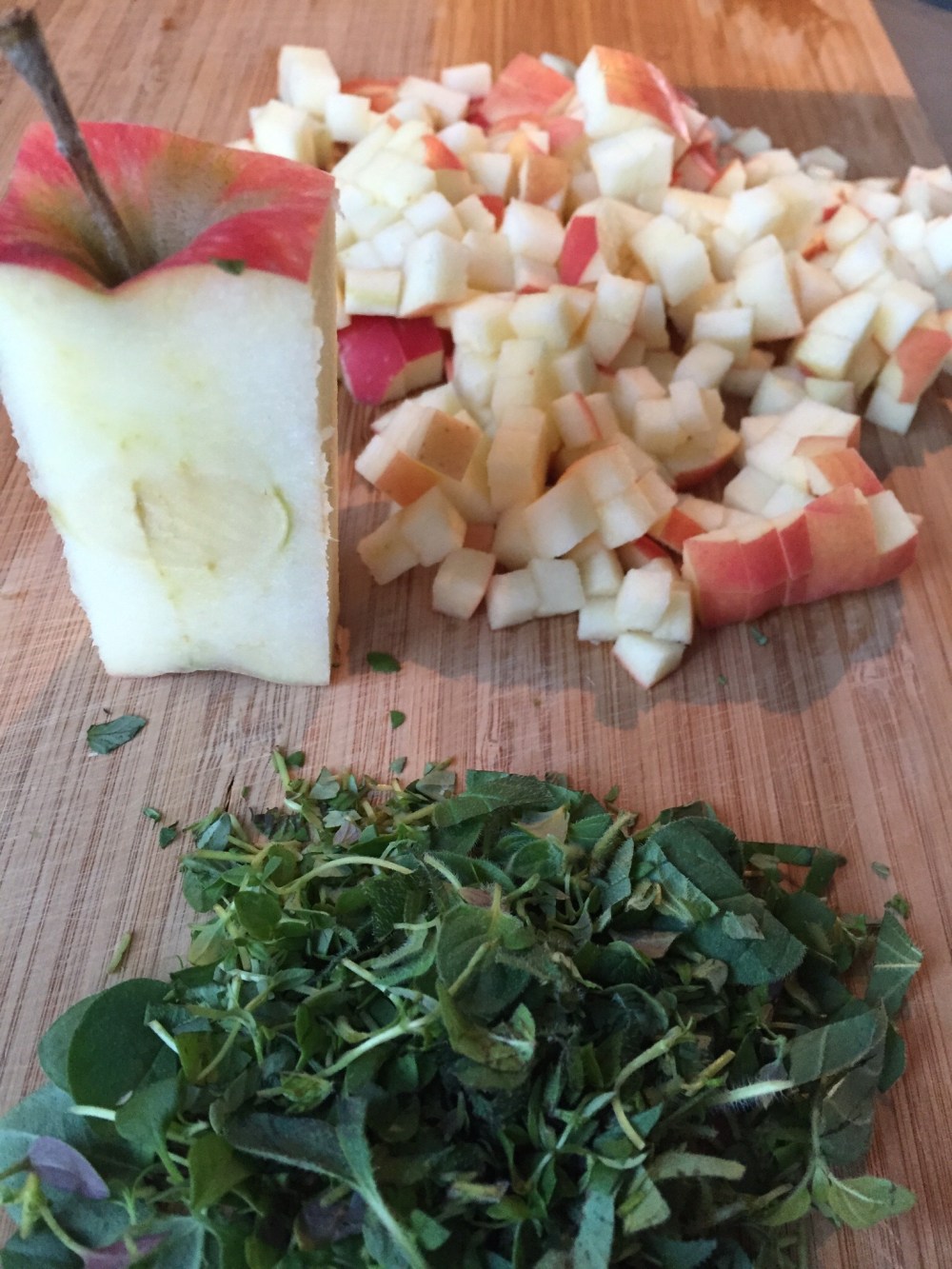 Skär äpplet i ca 5 mm stora bitar. Stek dem i pannan med fettet från köttet. Späd med grädden och vatten. Tillsätt koncentrerad kalvbuljong. Koka ihop till önskad tjocklek. Smaka av med salt och peppar.