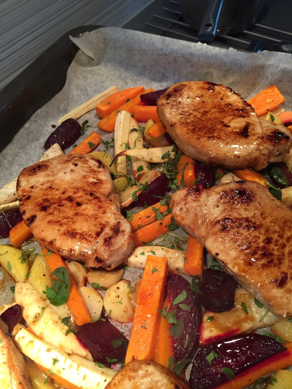 När rotfrukterna varit i ugnen 20-25 minuter tar du ut långpannan och lägg på hackade färska örter, vi hade timjan och oregano. Samt köttet och kör i ugnen ytterligare fem minuter.