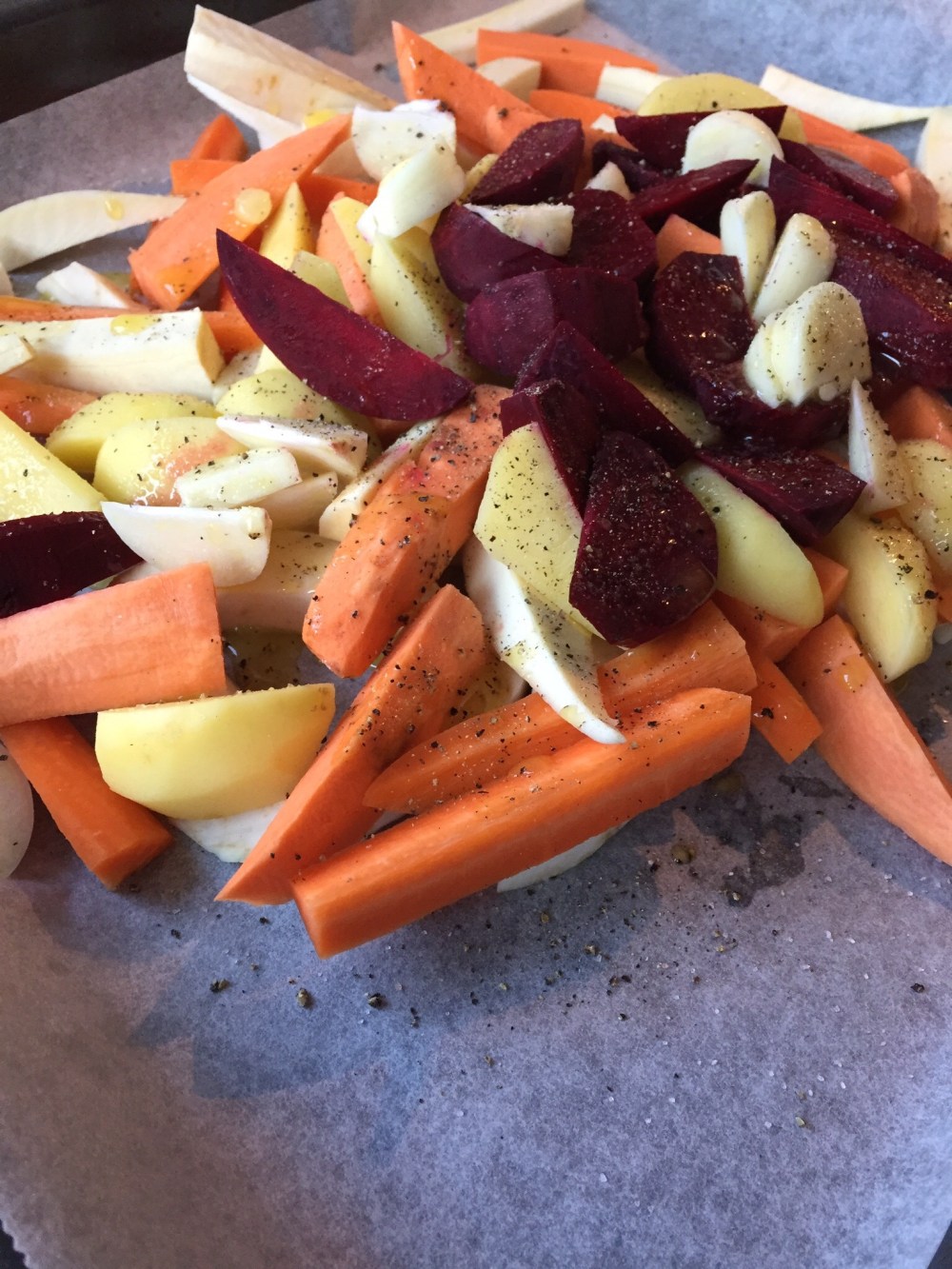 Sätt igen på 220 grader. Skala och skär ner potatis, morot, rödbeta, sötpotatis, palsternacka och rotselleri i ungefär lika stora delar. Skär vitlöken i bitar. Lägg i långpanna och drissla över lite vitlöksolja, salt och peppar. Blanda runt och vips in i ugnen. Ca 20-25 minuter.