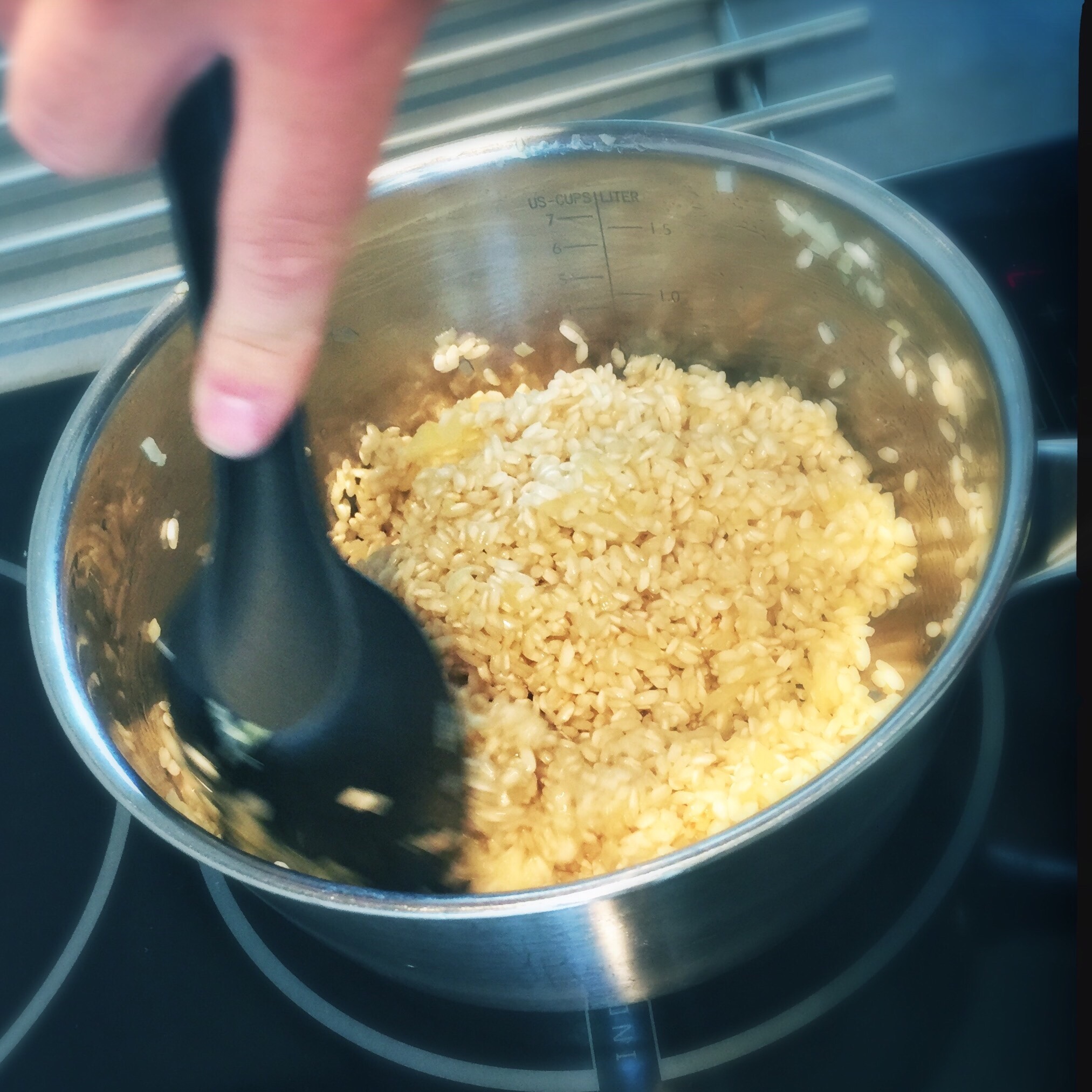 Koka upp vattnet med den koncentrerade buljongen. Hacka och fräs löken och kantarellerna i smöret, tillsätt riset och låt det fräsa med en liten stund. Slå på det vita vinet och ett par deciliter av buljongen. Låt riset puttra, utan lock, på ganska låg värme. När vätskan börjar försvinna späd med lite i taget och låt det koka in allteftersom. Fortsätt så tills riset känns klart men med en liten kärna. Risotton ska vara ganska rinnig, så det inte känns som gröt. Avsluta med att tillsätta den finrivna parmesanen. Smaksätt med lite salt och svartpeppar. Efter detta bör inte risotton koka mer. Känns den tjock späd med lite mer av buljongen. Syrade grönsaker: