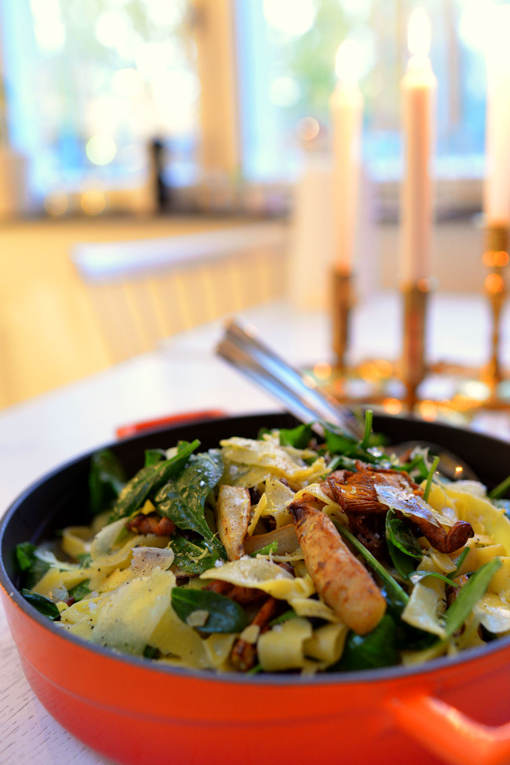 En riktigt god och snabblagad vegetarisk pasta full av höstens smaker. Jag använde kantareller men du kan självklart använda annan tillgänglig svamp istället, pastan kan du också variera efter smak. Persiljerot är en riktig höjdare tycker vi, den påminner om (och kan bytas ut mot) palsternacka. Men smaken på persiljeroten är inte lika sött och även lite fylligare.