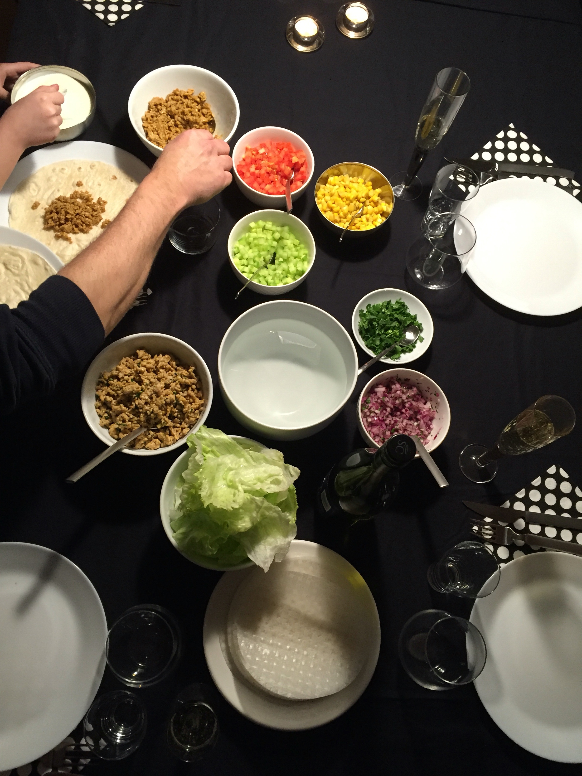 En nybliven favorit hos oss. Barnen väljer kycklingfärs med vanlig tacokrydda medan vi vuxna tycker thaismakerna är lite kul som omväxling till den vanliga tacon. Istället för tacoskal/bröd använder vi rispapper. Finns att köpa i välsorterade butiker eller i asiatiska butiker. Rispapperna doppade vi 5 sekunder i varmt vatten(från kranen) vid bordet. Sen är det bara att fylla sin taco efter önskemål.