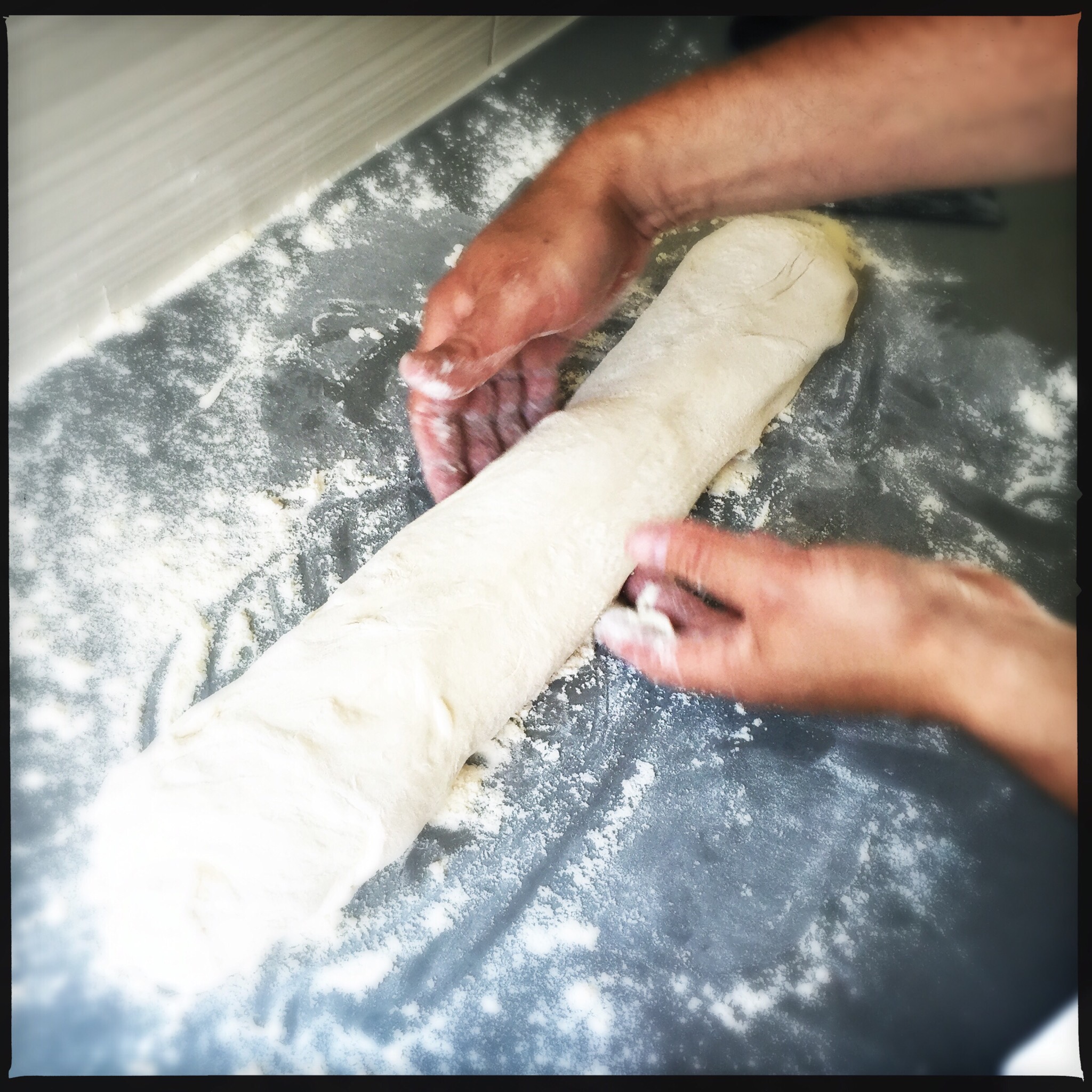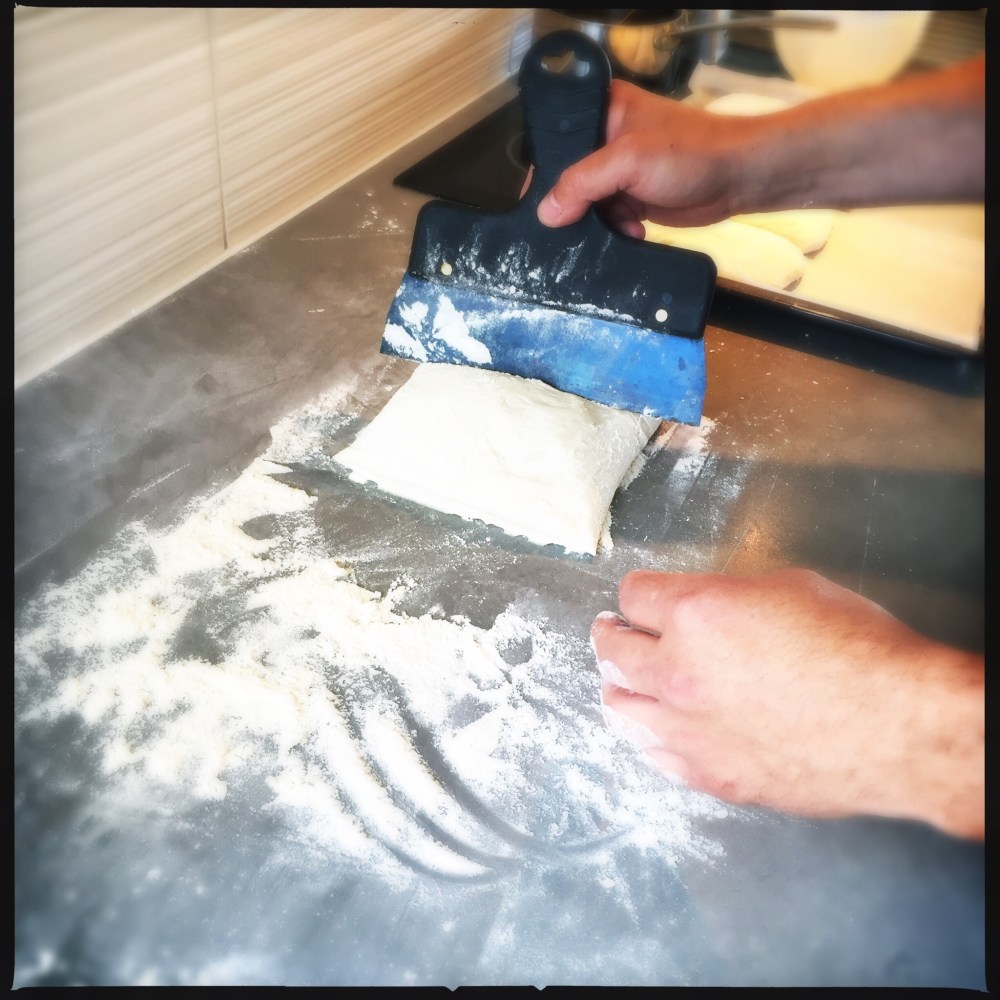 Lägg upp degen på ett mjölat bord och forma till en lång smal deg, ca 10cm bred. Täck över med en handduk och låt det jäsa en timme.