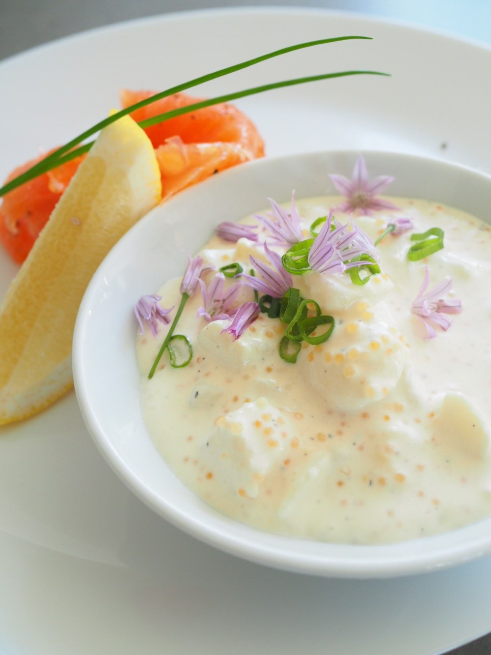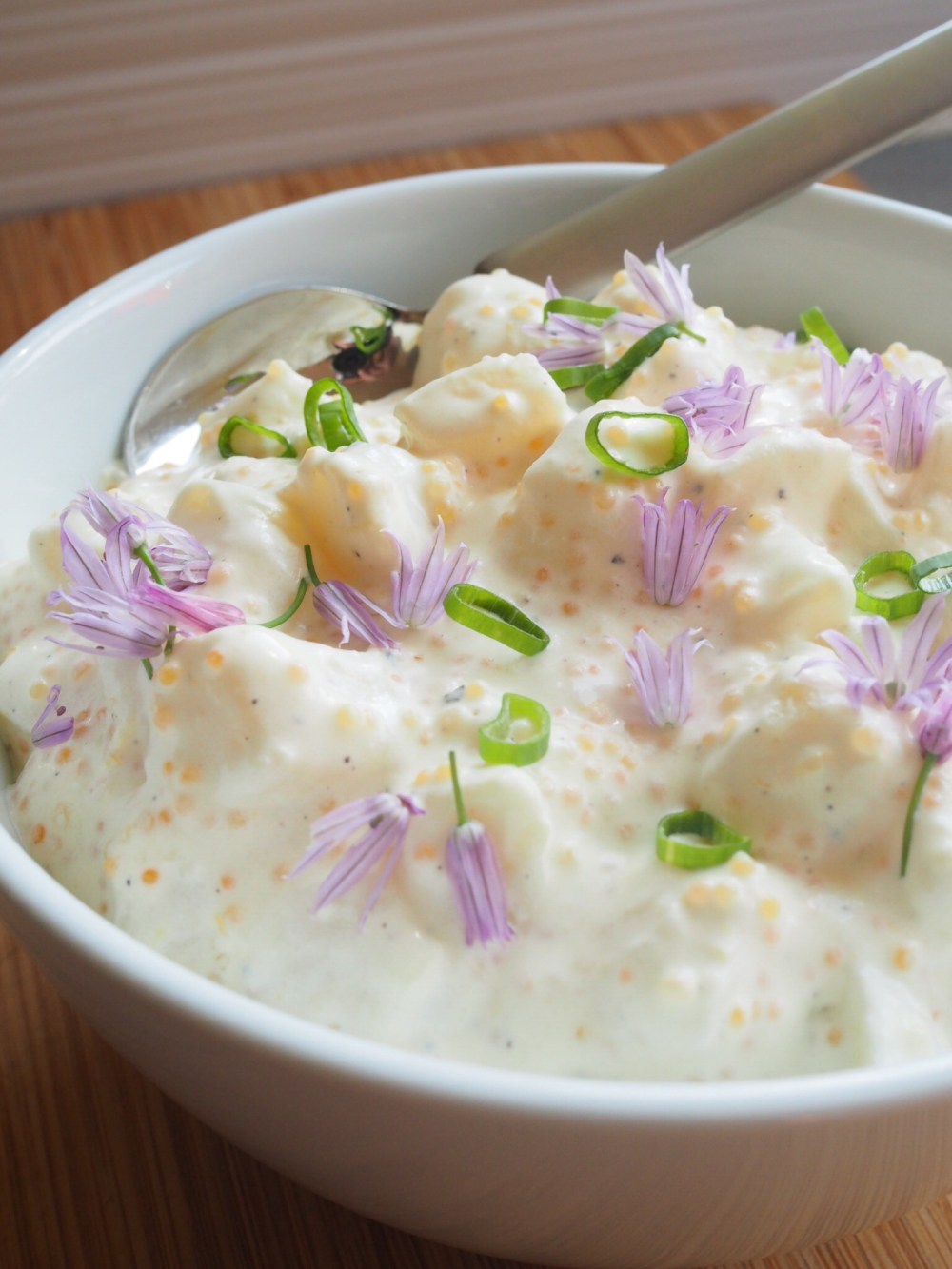 Tips! Garnera gärna med skivad vårlök och blommor från gräslöken.