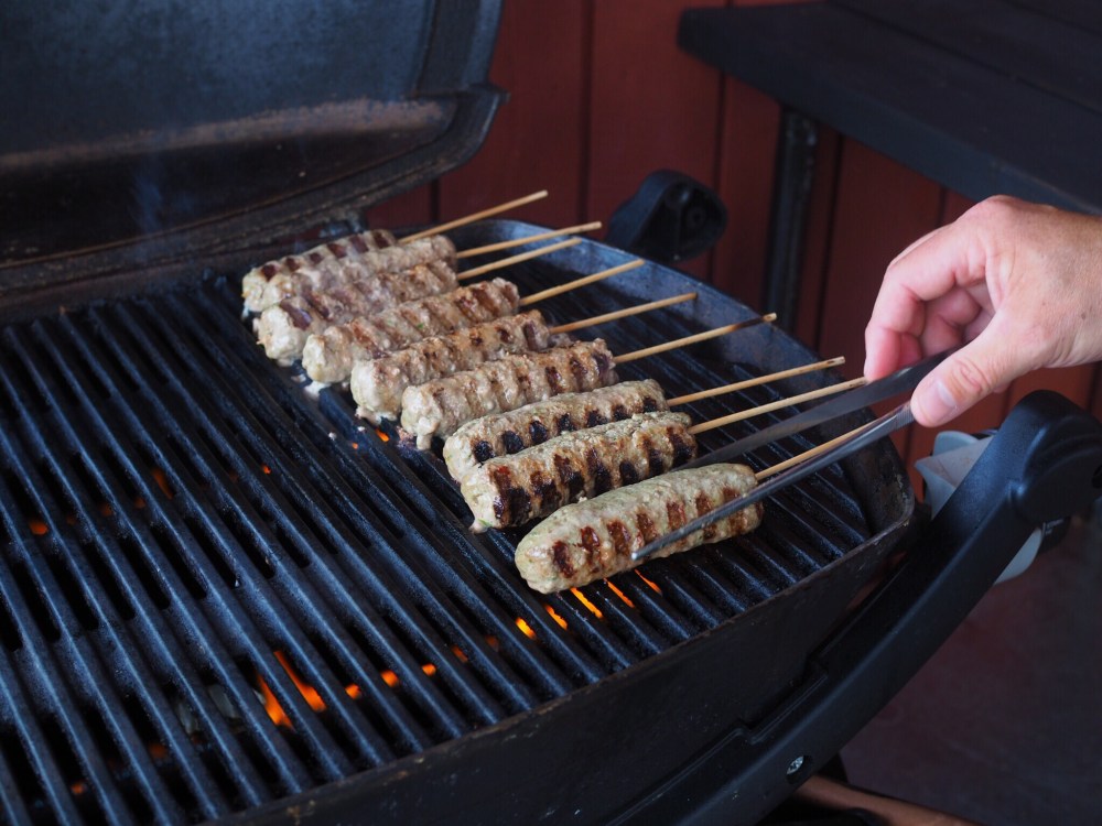 Mixa gul lök och vitlök med ägget. Blanda det med färden och salta och peppra efter smak. Dela färsen i bollar om 70g, rulla till korvar och trä upp dem på spett. Ställ in dem i kylskåpet så färsen ”sätter” sig lite så blir de lättare att grilla. Grilla eller stek sedan spetten