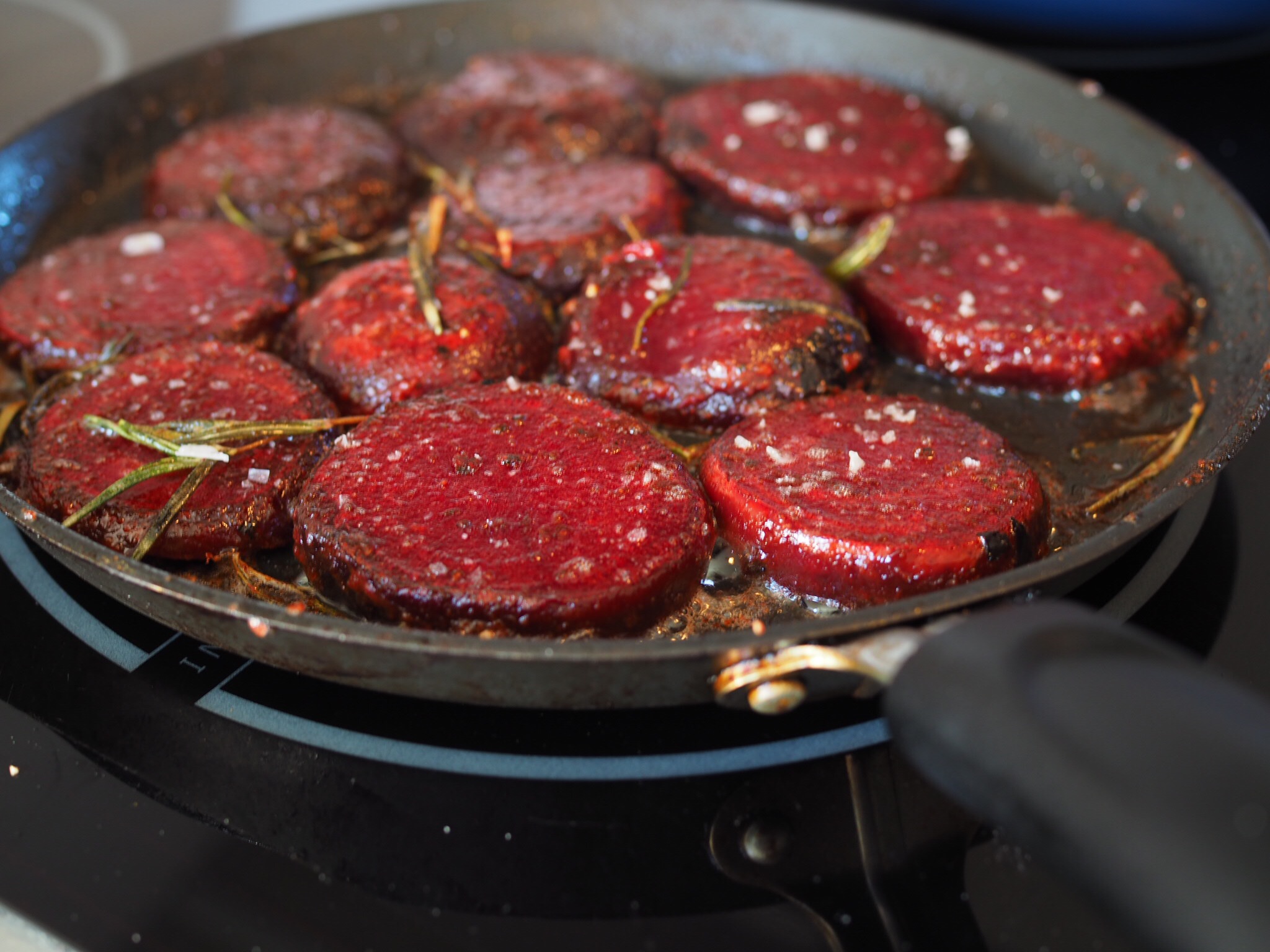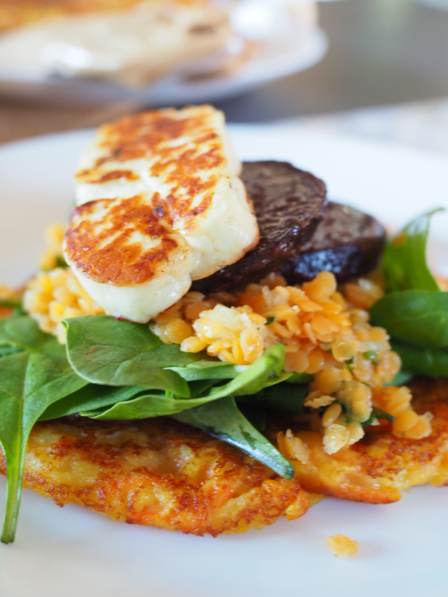 Vi serverade med flera tillbehör, tex denna linssalladen som du hittar här! Halloumi som jag stekte i skivor, stek på relativt hög värme så den får färg och yta innan den ”smälter”. En grön sallad. Jag köpte färdiga rödbetor för det var lite bråttom, skiva det i ca 1cm tjocka skivor och stek dem med mycket smör och vitlök och gärna rosmarin.