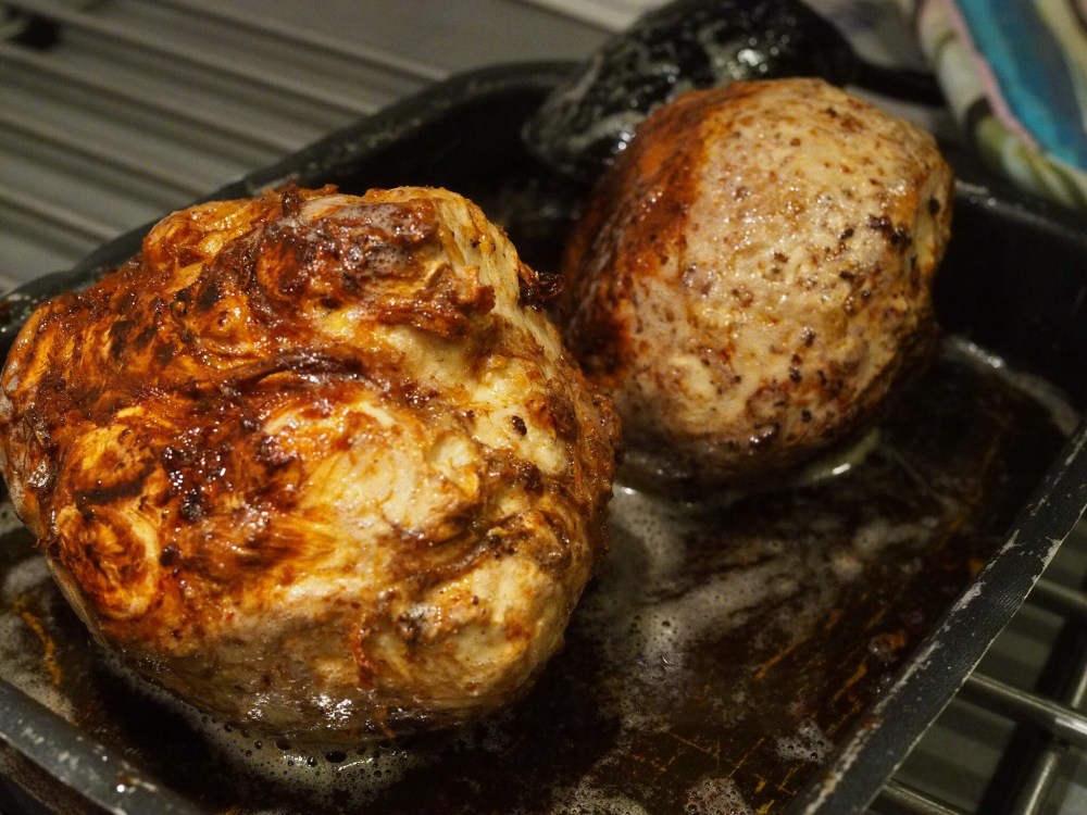 Sätt ugnen på 150 grader. Skölj och tvätta rotsellerin, skär bort det delarna som var jordiga. Lägg dem i en ugnsform och lägg smöret över dem. Smöret smälter och då ”öser” du rotsellerin. Jag öste varje tionde minut och snurrade på dem några gånger. Efter 1,5 timme ungefär skruvade jag upp värmen till 200 grader så de fick lite färg också. Totalt var de i ugnen 2 timmar. Ta till vara på det goda smöret, ringla det över maten på tallriken, gott!