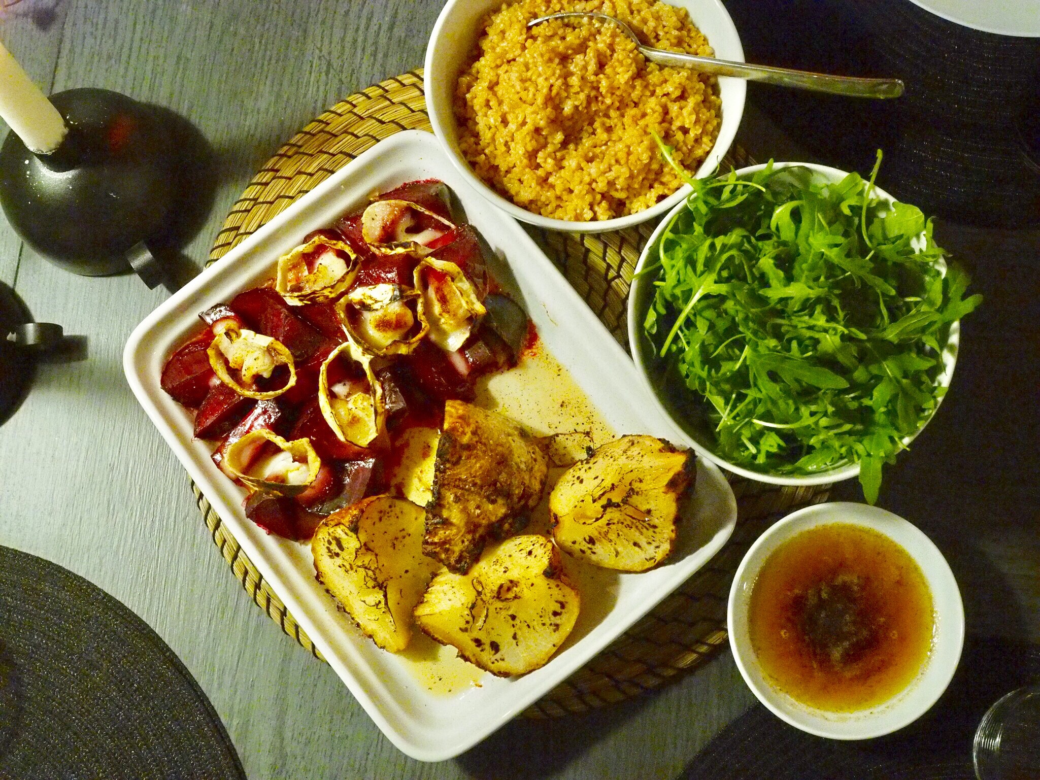 När rotsellerin gottade sig i ugnen förberedde jag tillbehören; röbetor som jag delade i bitar och skar getost över, detta gratinerades innan servering.