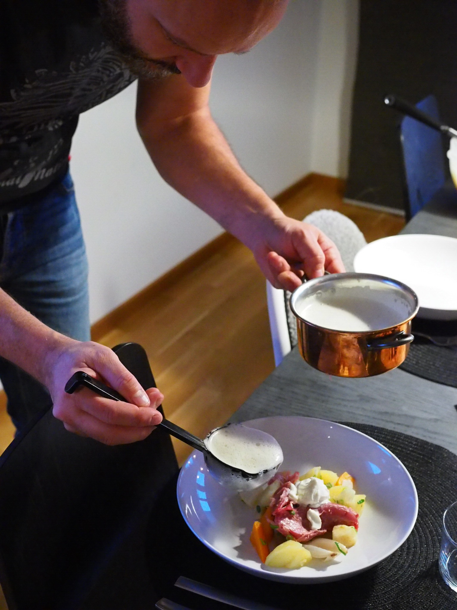 Koka upp spadet och smaka av med peppar och ev lite mer salt. Blir det för kraftig smak späd med vatten. Red såsen med lite maizenaredning, såsen ska vara ganska tunn men gärna lite simmig.Precis innan servering vispar du ner smöret, gärna med en stavmixer så blir såsen skummig och fin.