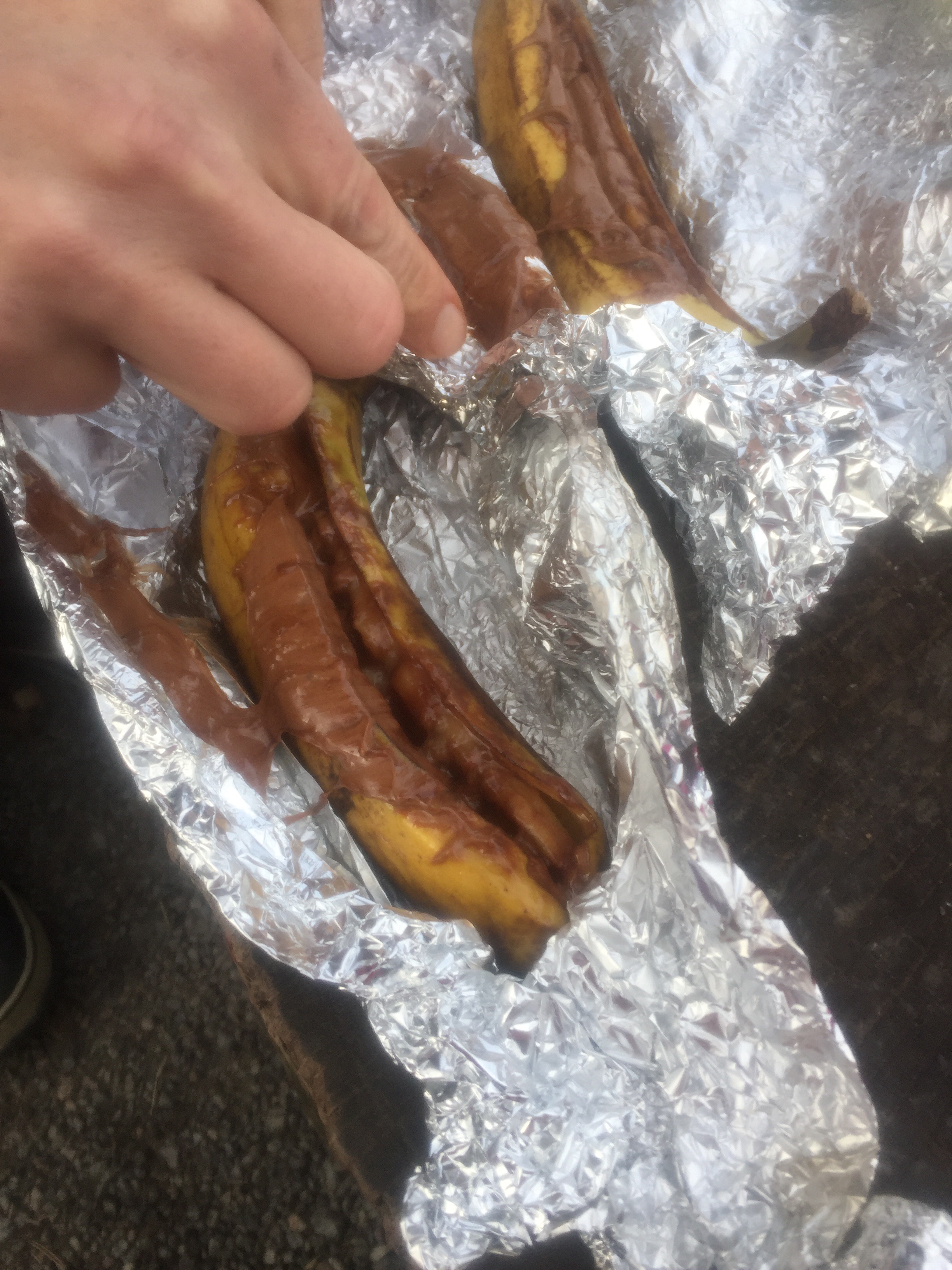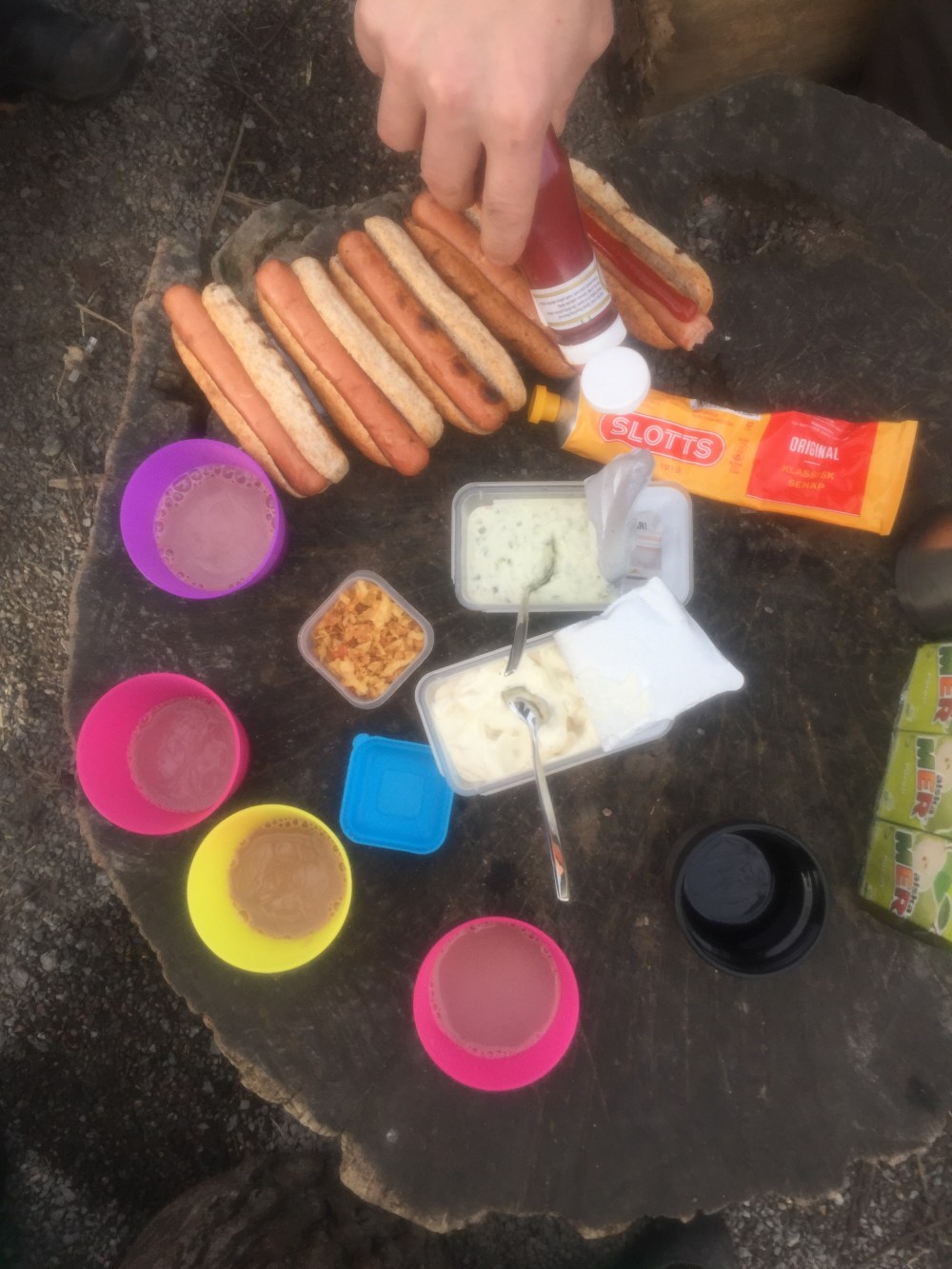Vi kastar oss på korven. Sigge äter bara bröd. Utan vare sig ketchup eller senap. Lo äter bara korv. Utan vare sig ketchup eller senap. Vi päron festar till på korv med bröd, ketchup, senap, potatissallad och rostad lök. Mums! Lo vägrar ha ordentliga vantar på sig och börjar nu bli riktigt kall. Men varm choklad är ju gott! Vi äter snabbt. Sedan festar vi till på höjdpunkten – grillade bananer med center i. Sjukt gott! Sigge käkar upp kexchokladen och deklarerar ”nu skiter vi i det här”.